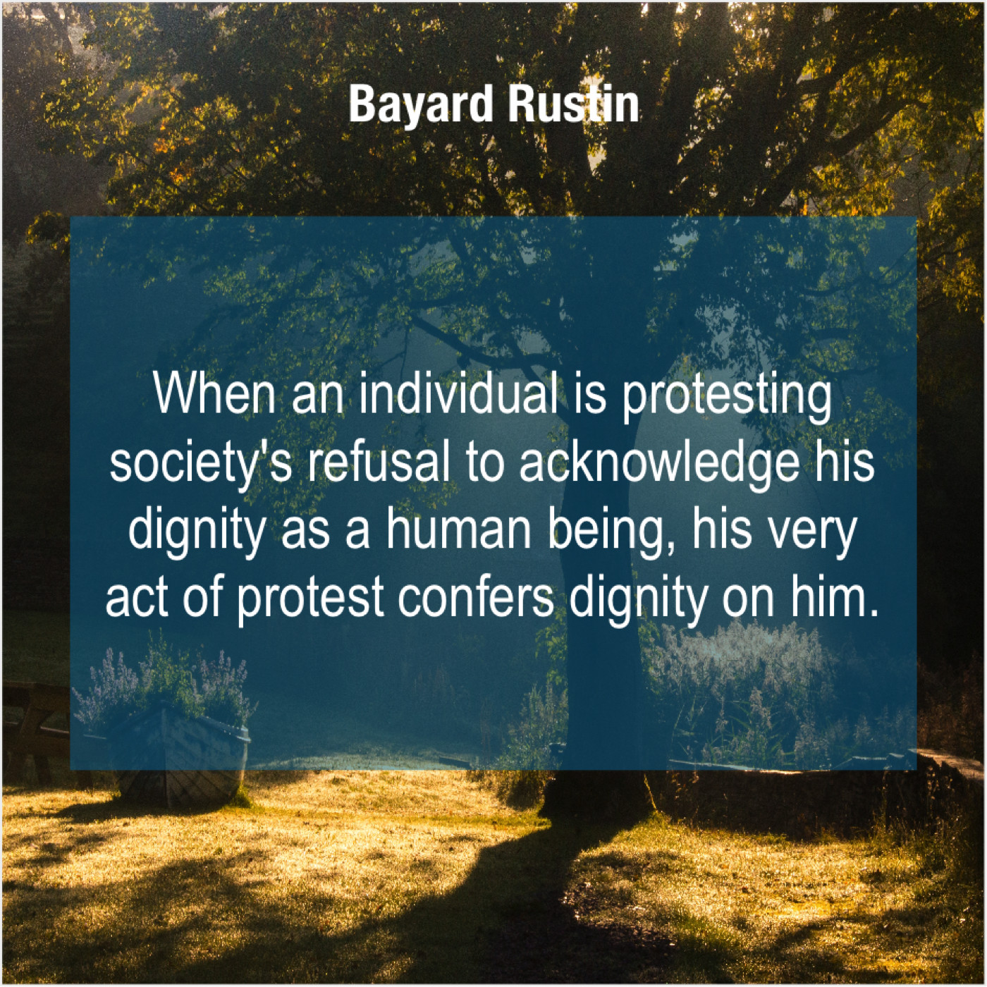 Bayard Rustin Bayard Rustin – When an individual is protesting… September 30, 2019 admin “When an individual is protesting society’s refusal to acknowledge his dignity as a human being, his very act of protest confers dignity on him.”-Bayard Rustin