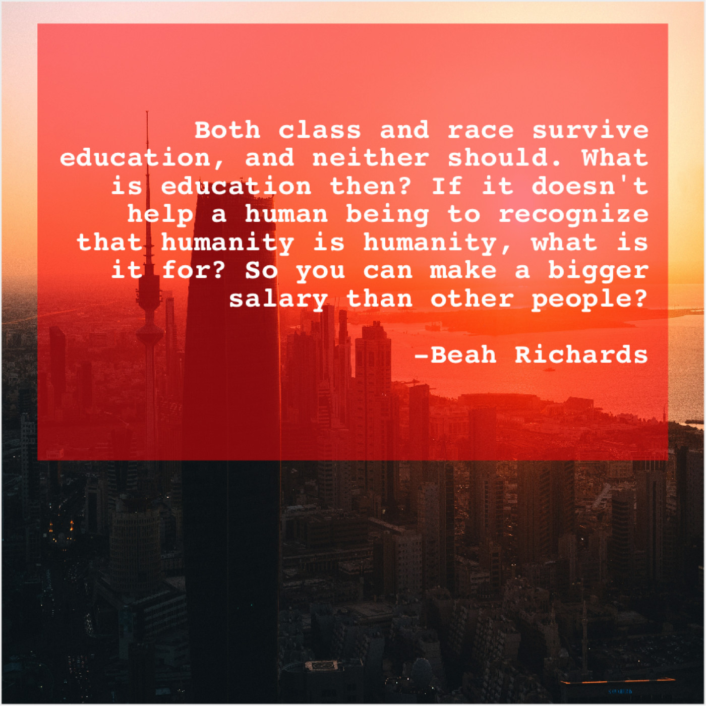 Beah Richards Beah Richards – Both class and race survive… July 25, 2019 admin “Both class and race survive education, and neither should. What is education then? If it doesn’t help a human being to recognize that humanity is humanity, what is it for? So you can make a bigger salary than other people?”-Beah Richards