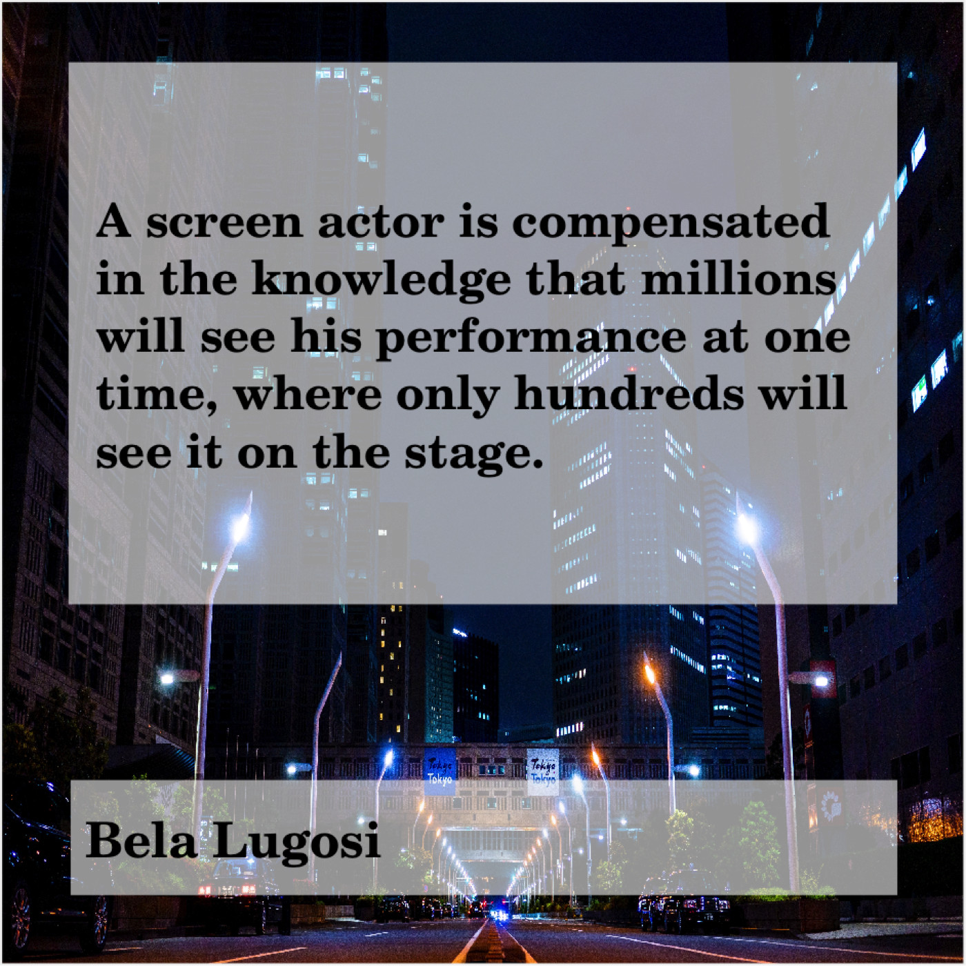 Bela Lugosi Bela Lugosi – A screen actor is compensated… August 27, 2019 admin “A screen actor is compensated in the knowledge that millions will see his performance at one time, where only hundreds will see it on the stage.”-Bela Lugosi