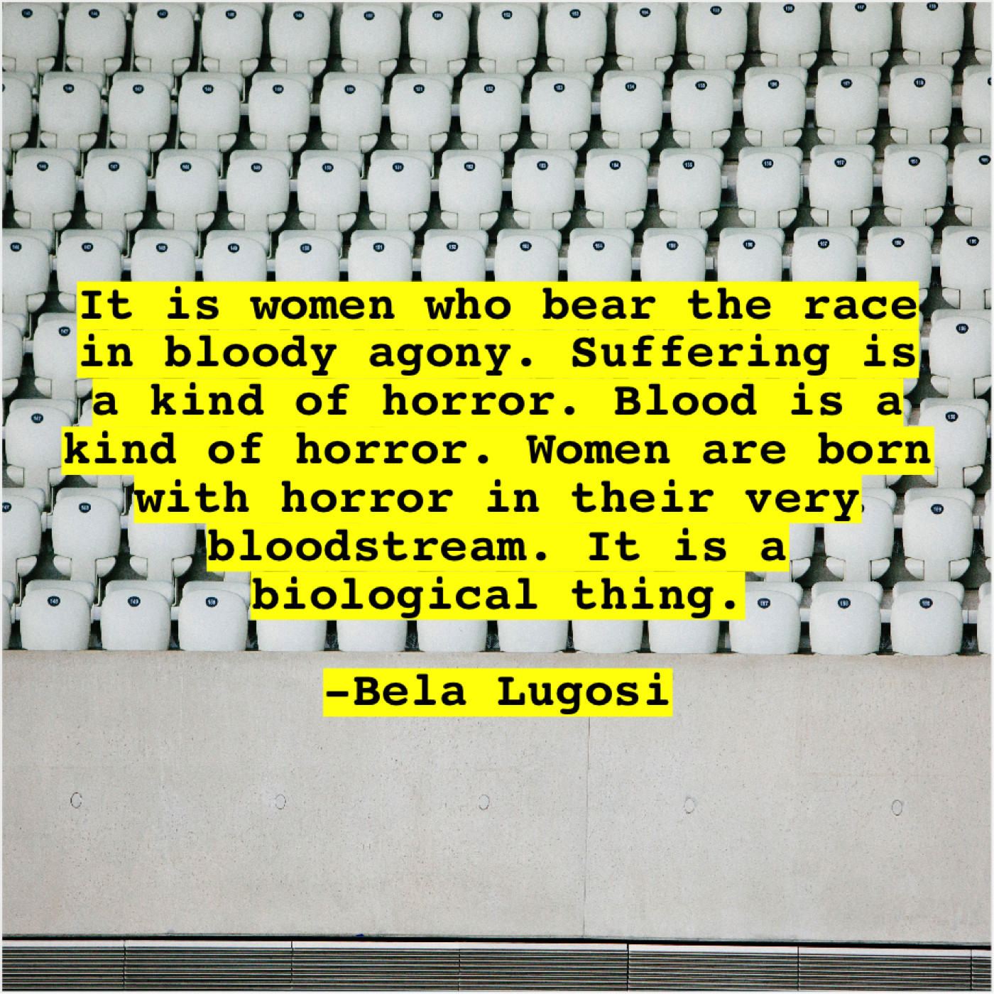 Bela Lugosi Bela Lugosi – It is women who bear… July 15, 2019 admin “It is women who bear the race in bloody agony. Suffering is a kind of horror. Blood is a kind of horror. Women are born with horror in their very bloodstream. It is a biological thing.”-Bela Lugosi