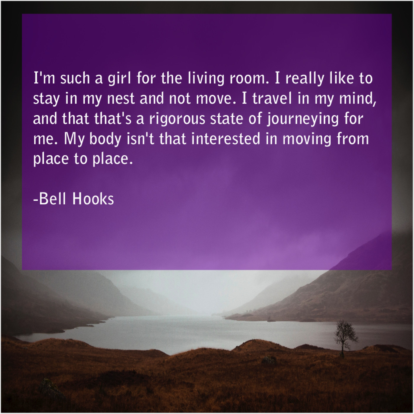 Bell Hooks Bell Hooks – I’m such a girl for… February 5, 2019 admin “I’m such a girl for the living room. I really like to stay in my nest and not move. I travel in my mind, and that that’s a rigorous state of journeying for me. My body isn’t that interested in moving from place to place.”-Bell Hooks