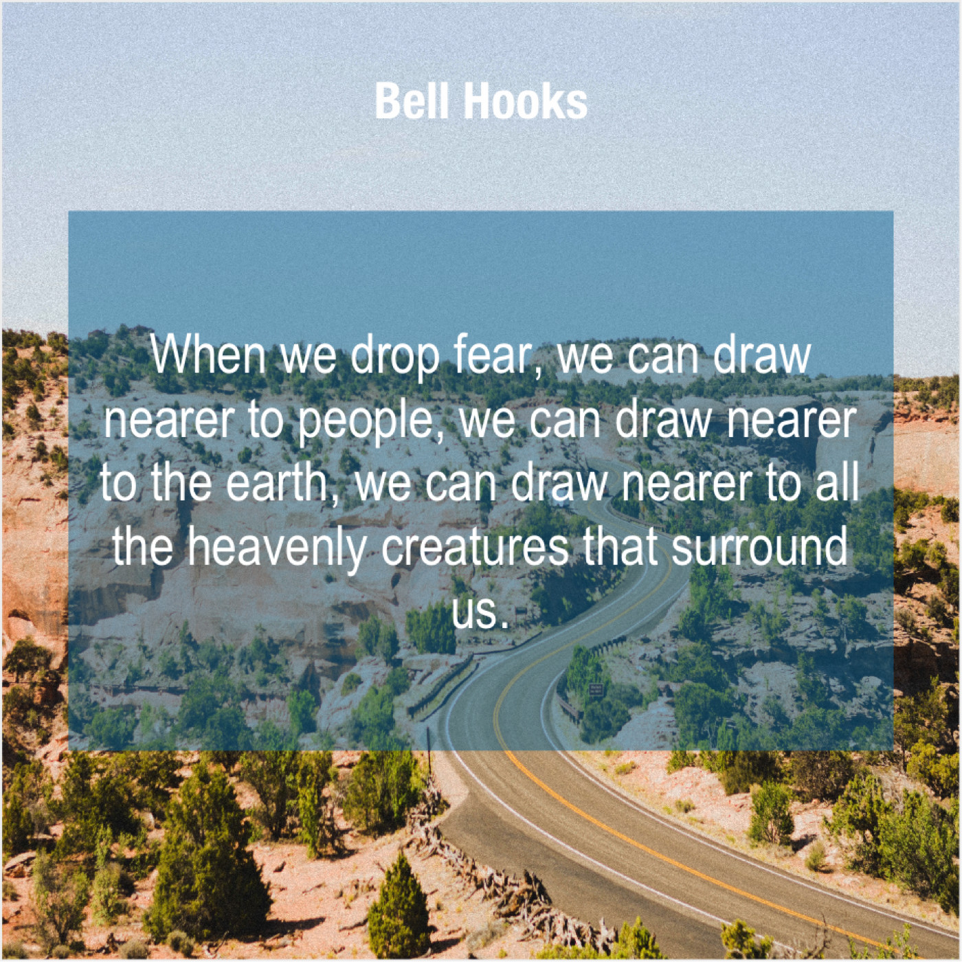 Bell Hooks Bell Hooks – When we drop fear, we… September 4, 2019 admin “When we drop fear, we can draw nearer to people, we can draw nearer to the earth, we can draw nearer to all the heavenly creatures that surround us.”-Bell Hooks