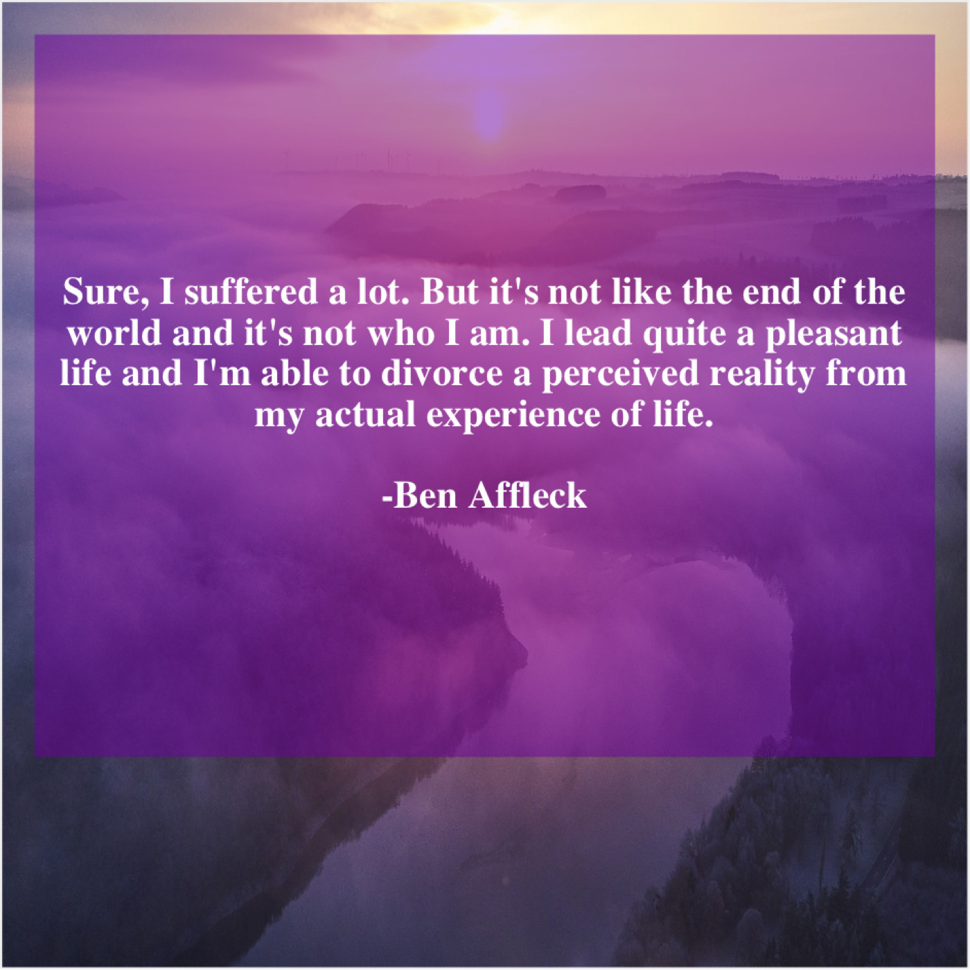 Ben Affleck Ben Affleck – Sure, I suffered a lot… December 6, 2018 admin “Sure, I suffered a lot. But it’s not like the end of the world and it’s not who I am. I lead quite a pleasant life and I’m able to divorce a perceived reality from my actual experience of life.”-Ben Affleck