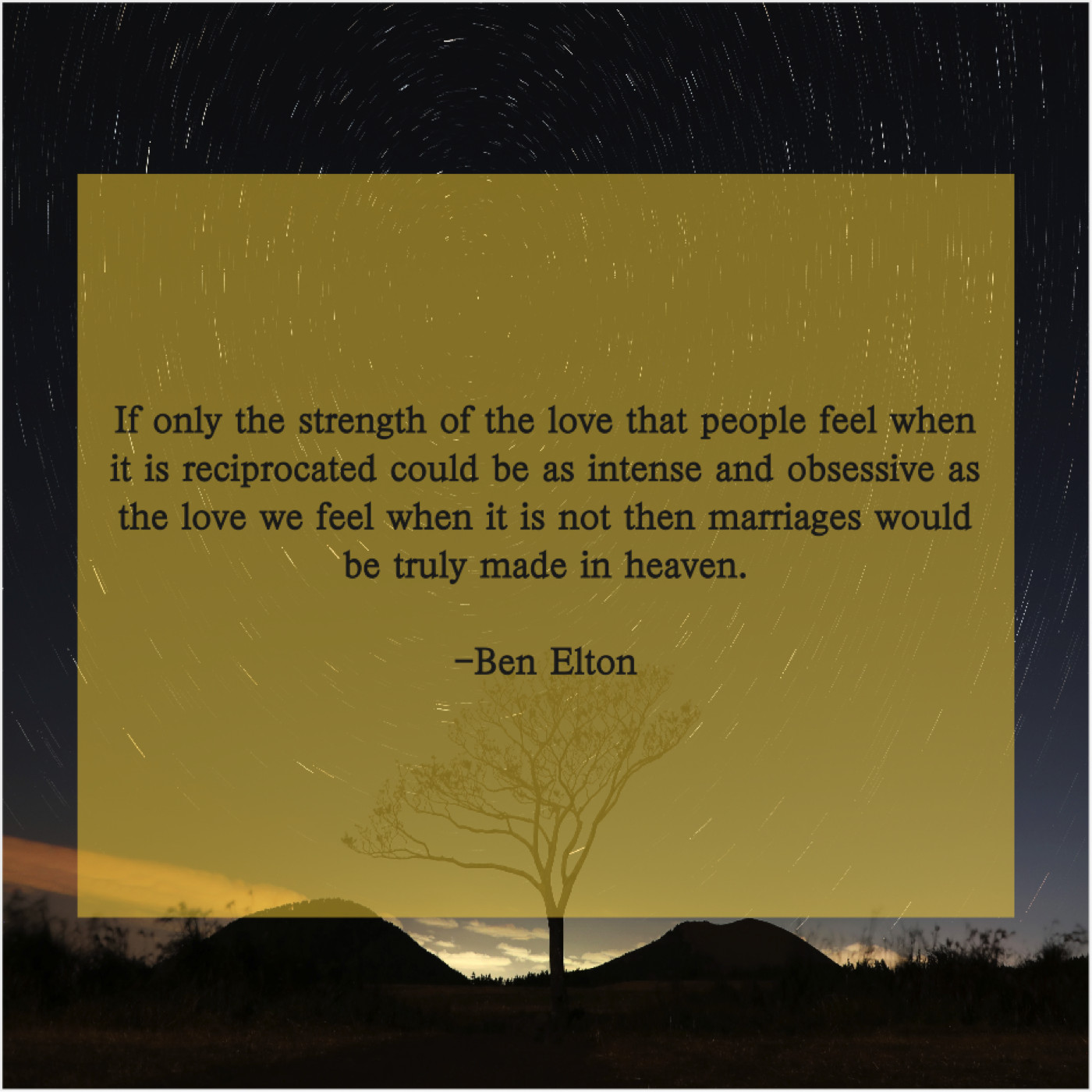 Ben Elton Ben Elton – If only the strength of… June 10, 2019 admin “If only the strength of the love that people feel when it is reciprocated could be as intense and obsessive as the love we feel when it is not then marriages would be truly made in heaven.”-Ben Elton
