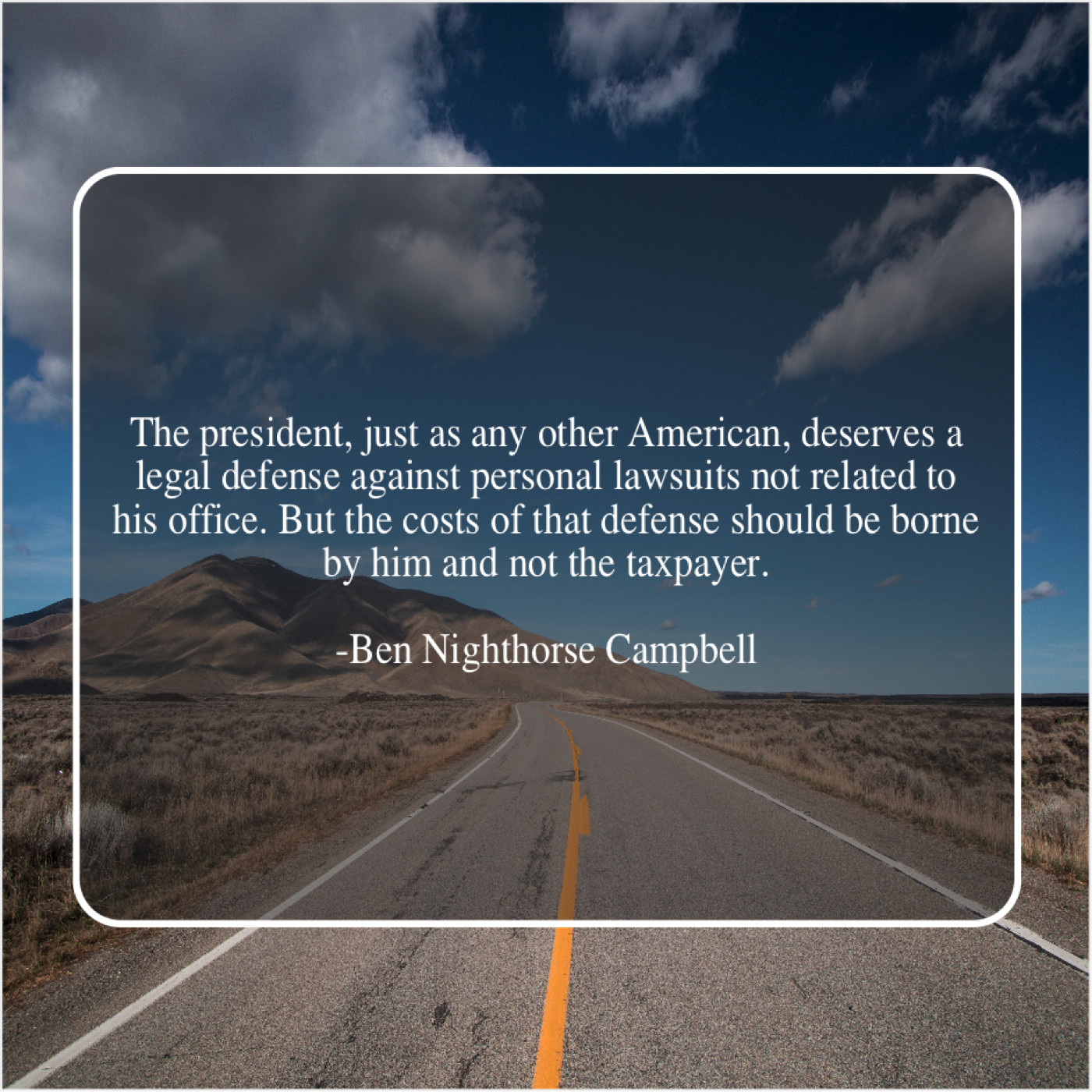 Ben Nighthorse Campbell Ben Nighthorse Campbell – The president, just as any… April 2, 2019 admin “The president, just as any other American, deserves a legal defense against personal lawsuits not related to his office. But the costs of that defense should be borne by him and not the taxpayer.”-Ben Nighthorse Campbell