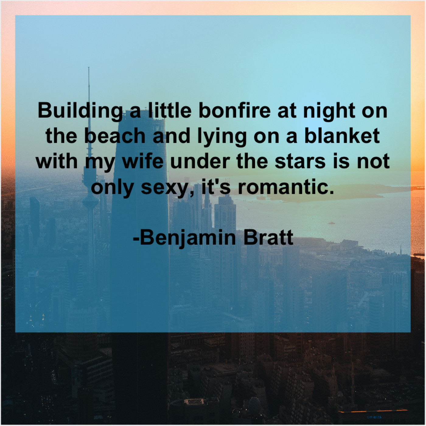 Benjamin Bratt Benjamin Bratt – Building a little bonfire at… August 11, 2019 admin “Building a little bonfire at night on the beach and lying on a blanket with my wife under the stars is not only sexy, it’s romantic.”-Benjamin Bratt