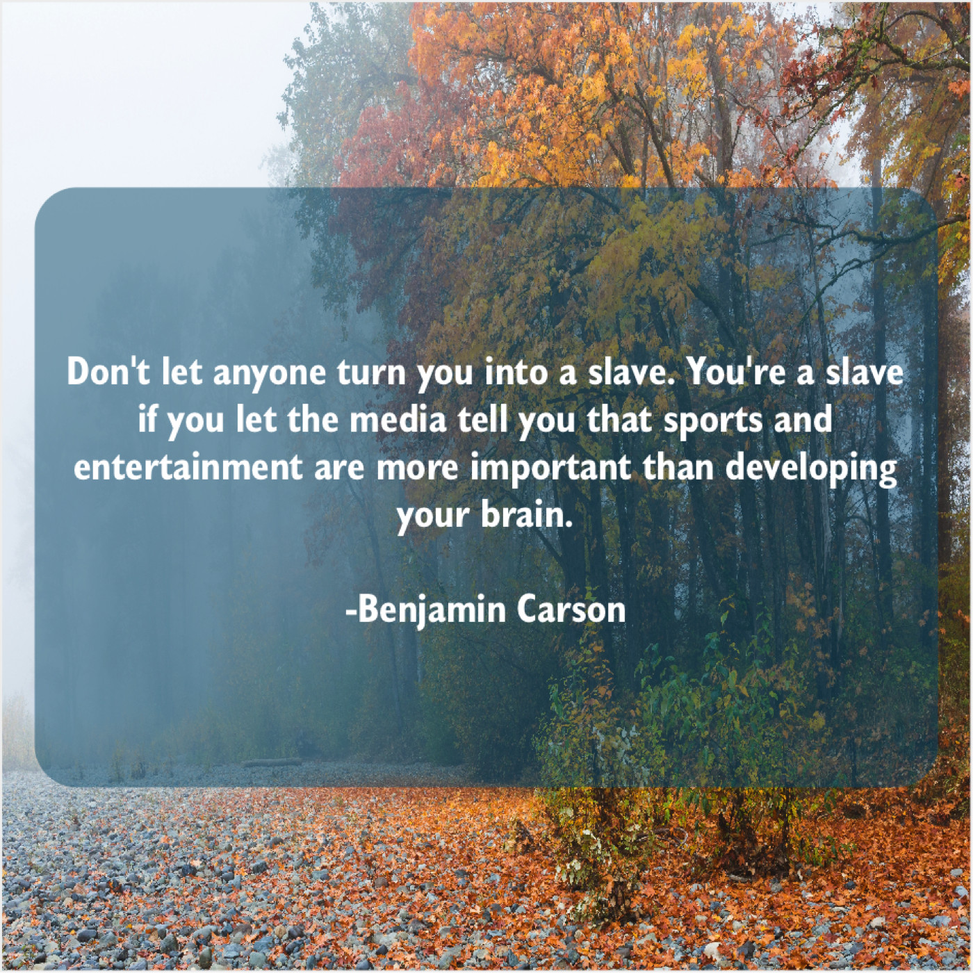 Benjamin Carson Benjamin Carson – Don’t let anyone turn you… August 13, 2019 admin “Don’t let anyone turn you into a slave. You’re a slave if you let the media tell you that sports and entertainment are more important than developing your brain.”-Benjamin Carson