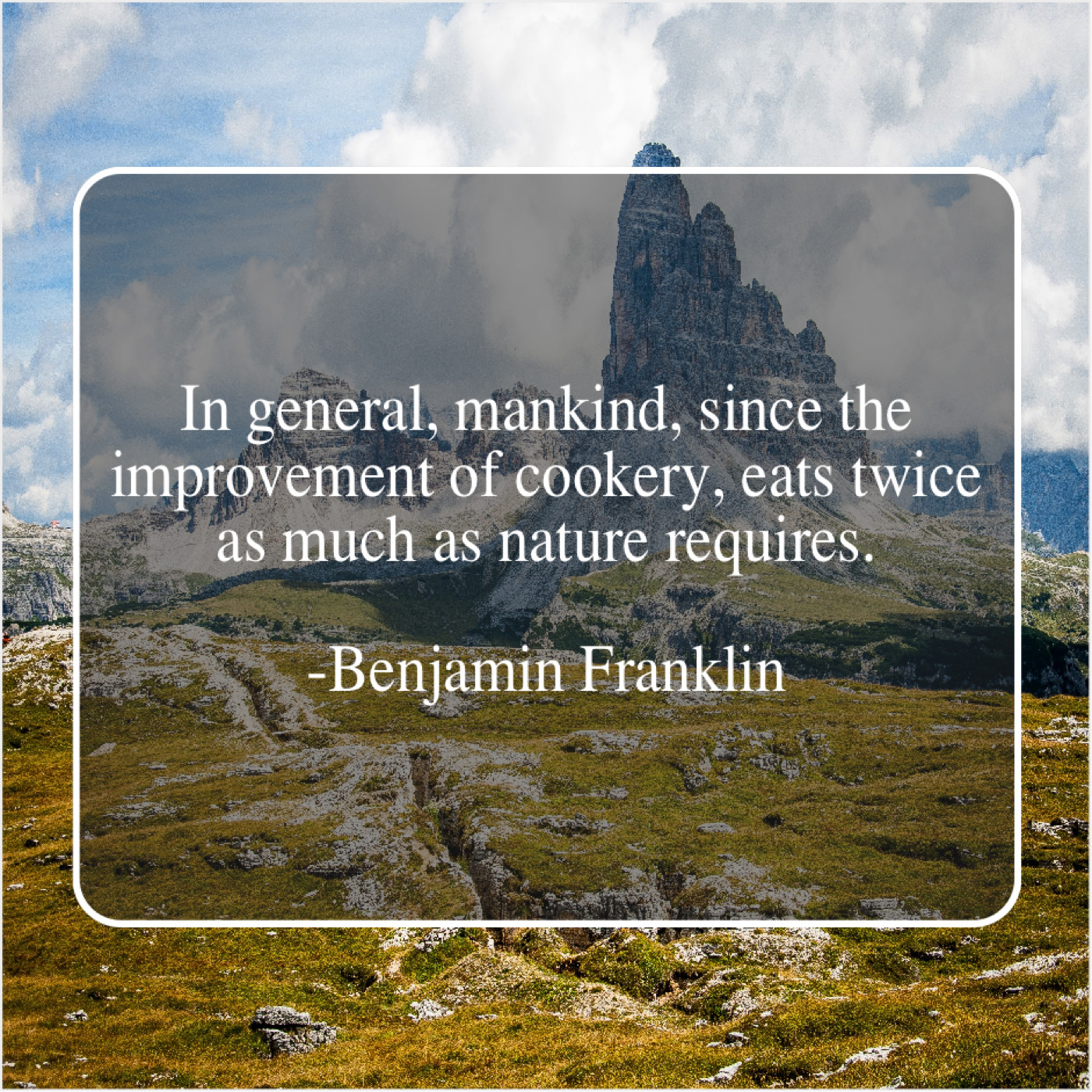 Benjamin Franklin Benjamin Franklin – In general, mankind, since the… April 27, 2019 admin “In general, mankind, since the improvement of cookery, eats twice as much as nature requires.”-Benjamin Franklin
