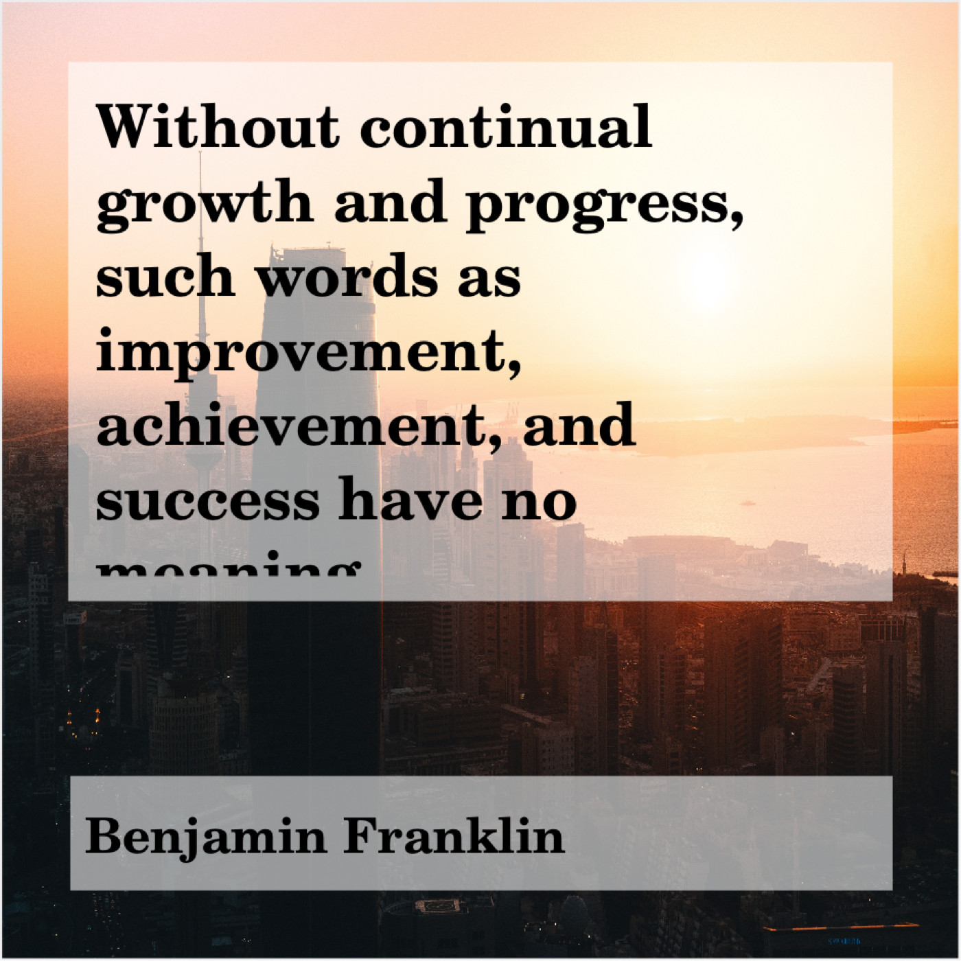 Benjamin Franklin Benjamin Franklin – Without continual growth and progress… June 11, 2019 admin “Without continual growth and progress, such words as improvement, achievement, and success have no meaning.”-Benjamin Franklin