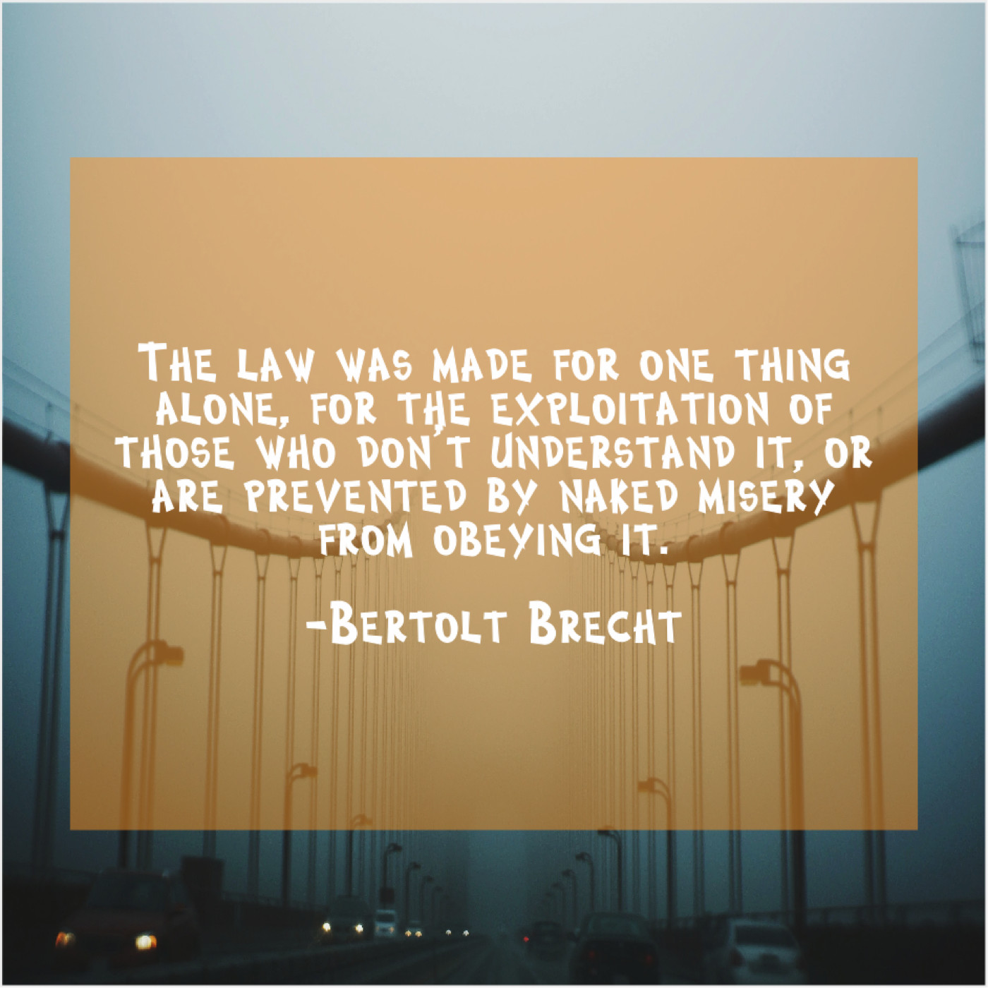 Bertolt Brecht Bertolt Brecht – The law was made for… April 25, 2019 admin “The law was made for one thing alone, for the exploitation of those who don’t understand it, or are prevented by naked misery from obeying it.”-Bertolt Brecht