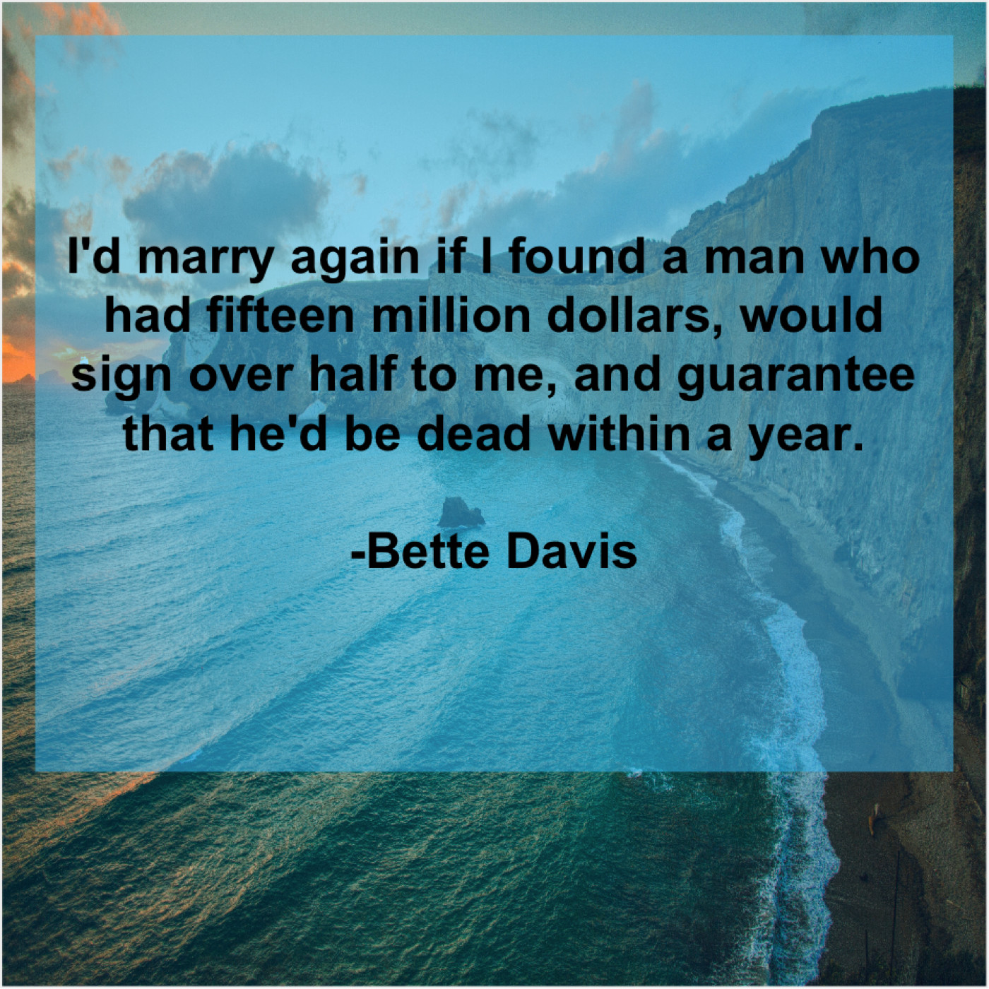 Bette Davis Bette Davis – I’d marry again if I… October 15, 2019 admin “I’d marry again if I found a man who had fifteen million dollars, would sign over half to me, and guarantee that he’d be dead within a year.”-Bette Davis