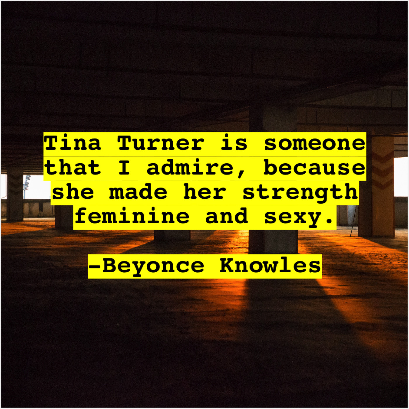 Beyonce Knowles Beyonce Knowles – Tina Turner is someone that… December 1, 2018 admin “Tina Turner is someone that I admire, because she made her strength feminine and sexy.”-Beyonce Knowles