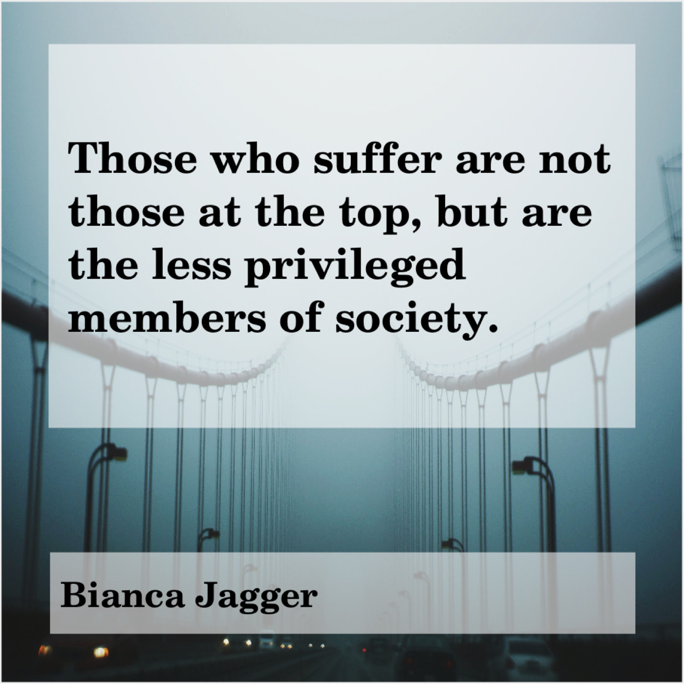 Bianca Jagger Bianca Jagger – Those who suffer are not… October 5, 2019 admin “Those who suffer are not those at the top, but are the less privileged members of society.”-Bianca Jagger