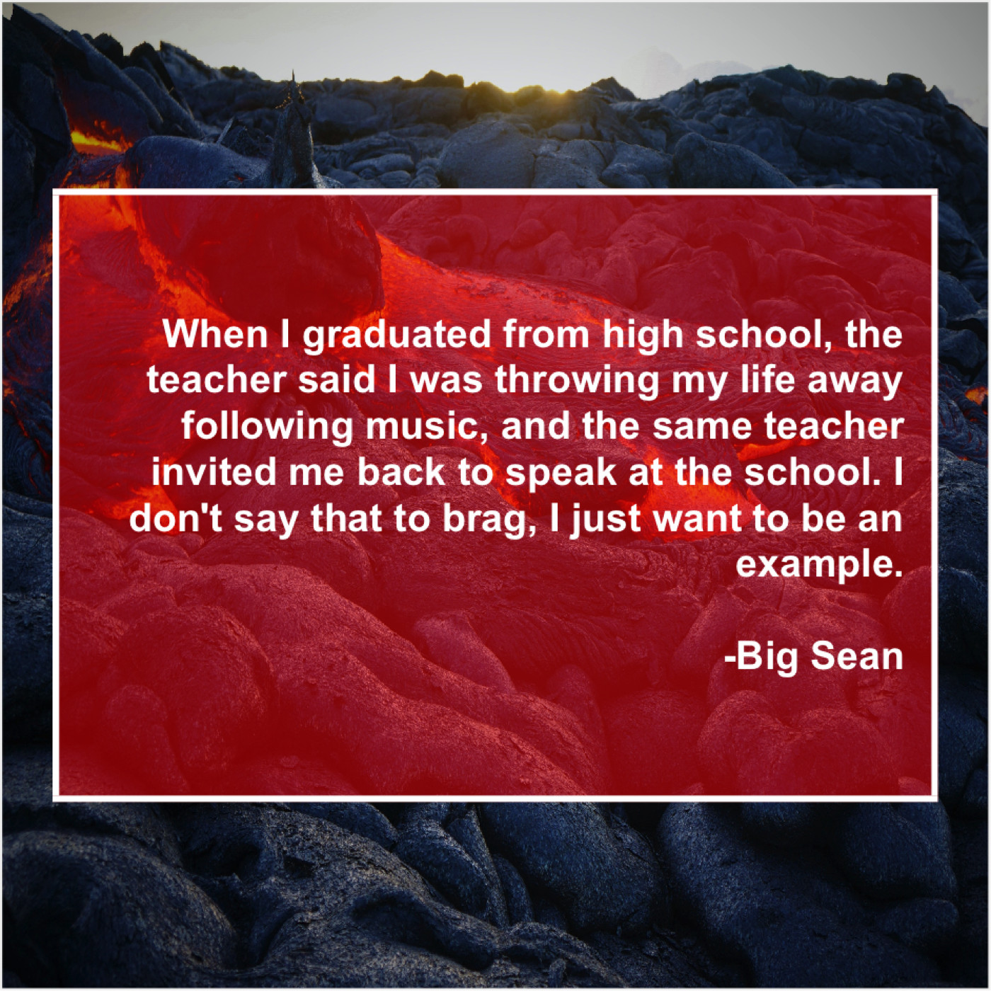 Big Sean Big Sean – When I graduated from high… July 24, 2019 admin “When I graduated from high school, the teacher said I was throwing my life away following music, and the same teacher invited me back to speak at the school. I don’t say that to brag, I just want to be an example.”-Big Sean