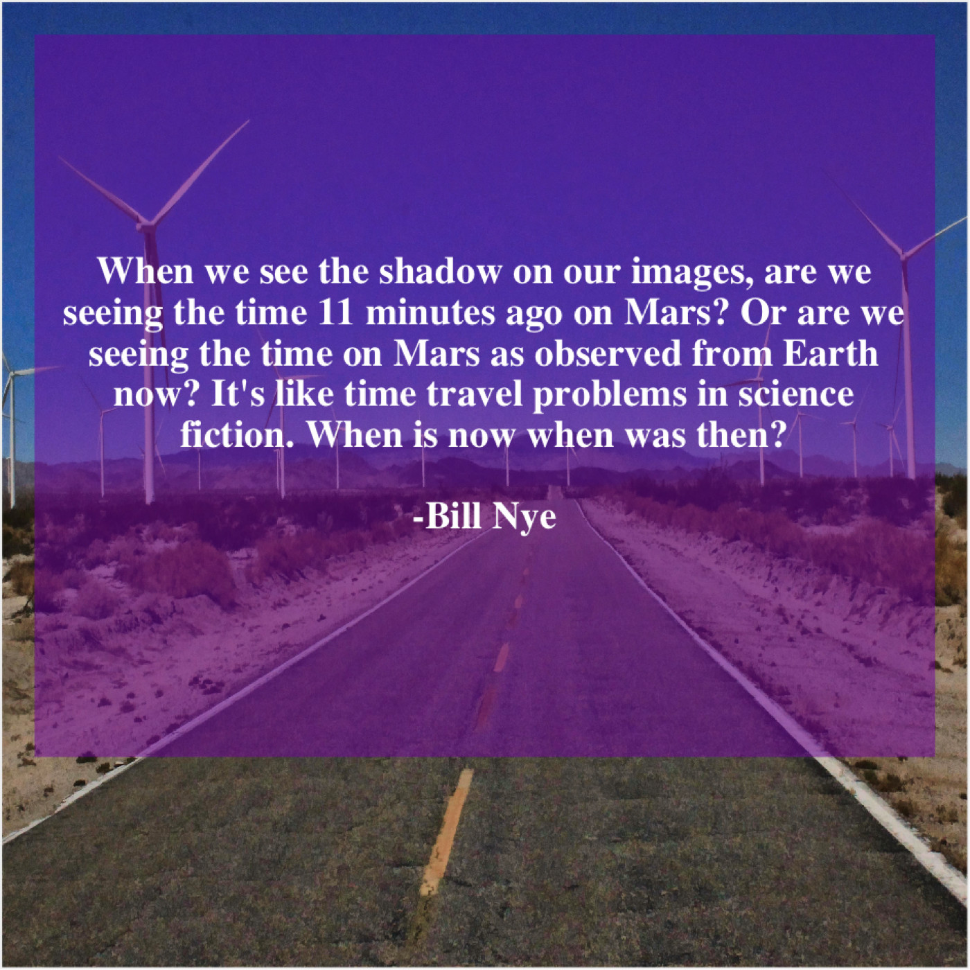 Bill Nye Bill Nye – When we see the shadow… March 13, 2019 admin “When we see the shadow on our images, are we seeing the time 11 minutes ago on Mars? Or are we seeing the time on Mars as observed from Earth now? It’s like time travel problems in science fiction. When is now when was then?”-Bill Nye