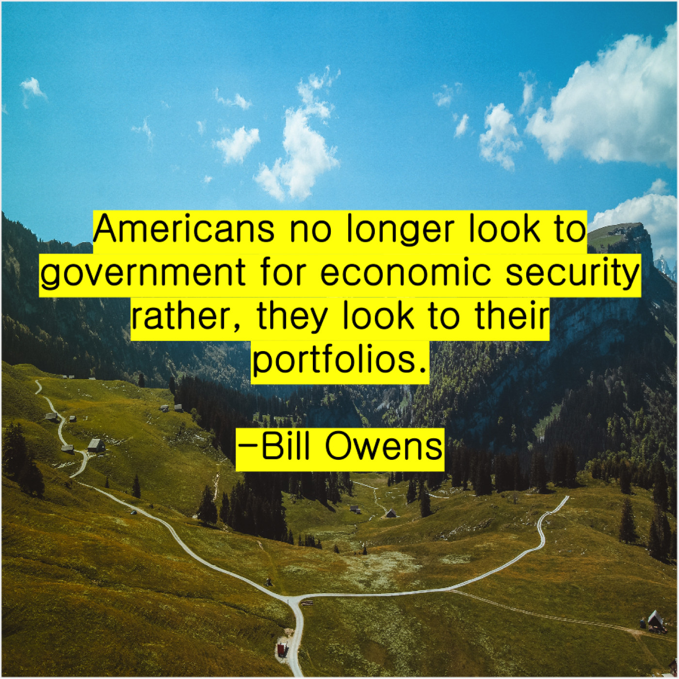 Bill Owens Bill Owens – Americans no longer look to… October 10, 2019 admin “Americans no longer look to government for economic security rather, they look to their portfolios.”-Bill Owens