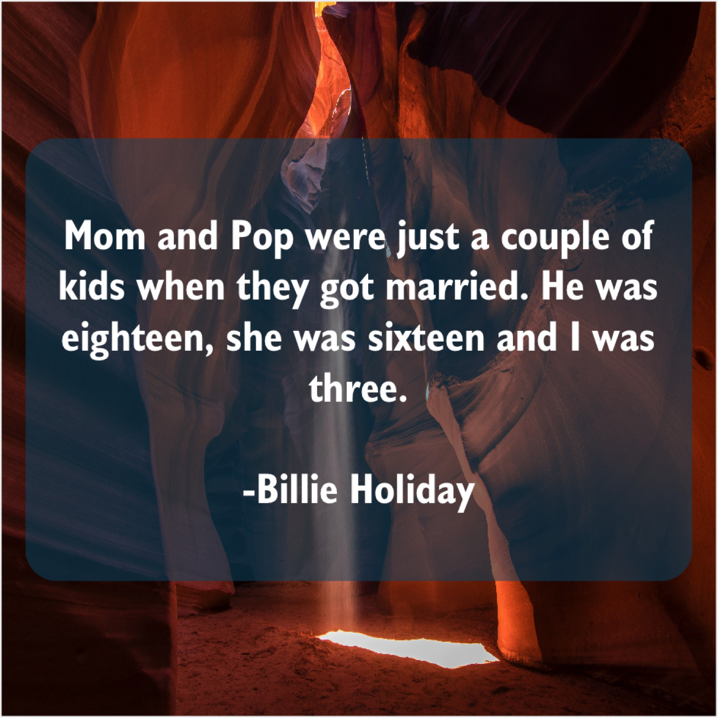 Billie Holiday Billie Holiday – Mom and Pop were just… June 24, 2019 admin “Mom and Pop were just a couple of kids when they got married. He was eighteen, she was sixteen and I was three.”-Billie Holiday
