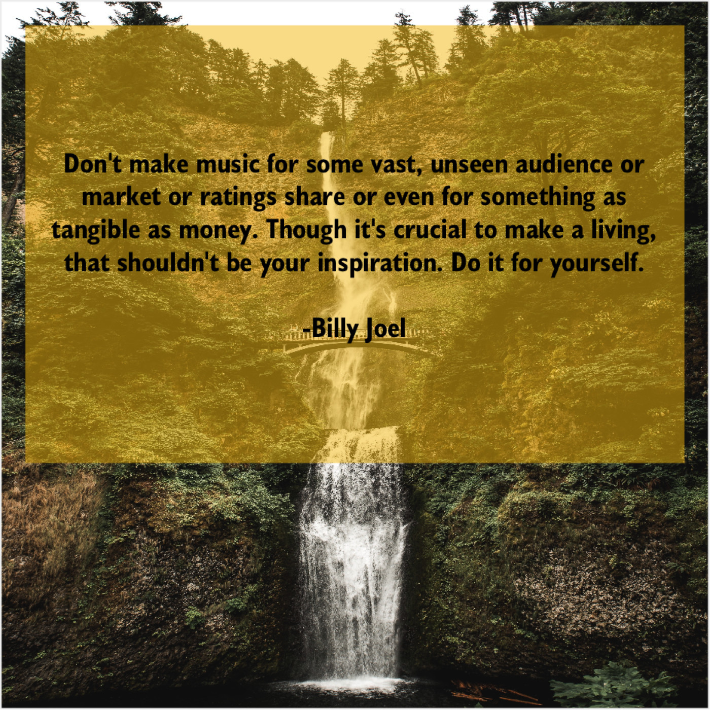 Billy Joel Billy Joel – Don’t make music for some… May 18, 2019 admin “Don’t make music for some vast, unseen audience or market or ratings share or even for something as tangible as money. Though it’s crucial to make a living, that shouldn’t be your inspiration. Do it for yourself.”-Billy Joel