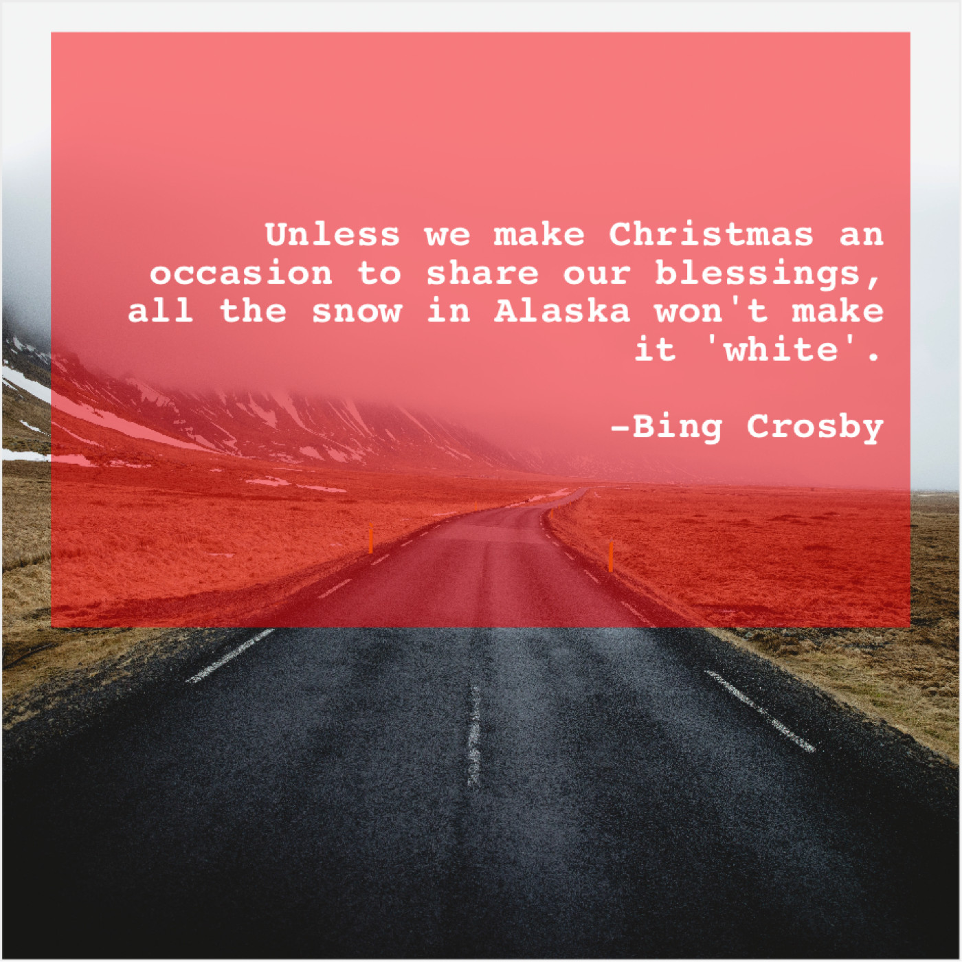 Bing Crosby Bing Crosby – Unless we make Christmas an… April 20, 2019 admin “Unless we make Christmas an occasion to share our blessings, all the snow in Alaska won’t make it ‘white’.”-Bing Crosby