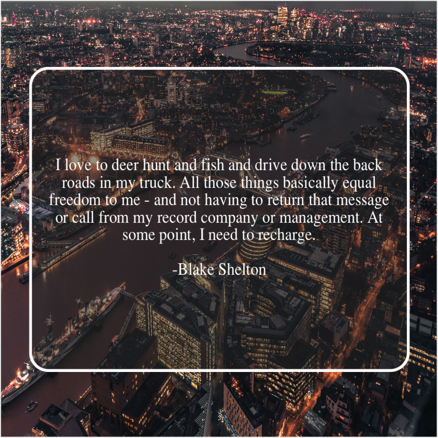 “I love to deer hunt and fish and drive down the back roads in my truck. All those things basically equal freedom to me – and not having to return that message or call from my record company or management. At some point, I need to recharge.”