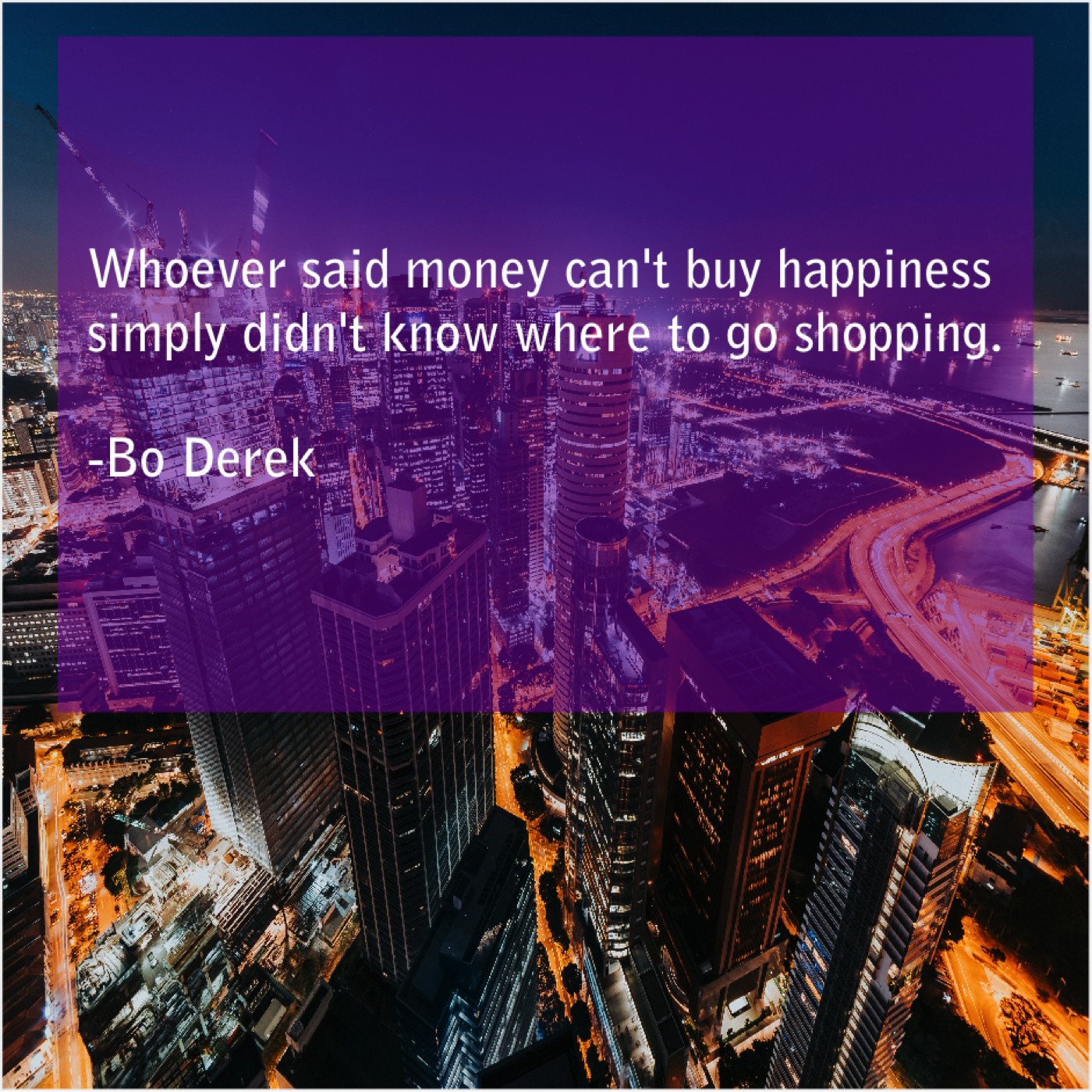 Bo Derek Bo Derek – Whoever said money can’t buy… October 31, 2018 admin “Whoever said money can’t buy happiness simply didn’t know where to go shopping.”-Bo Derek