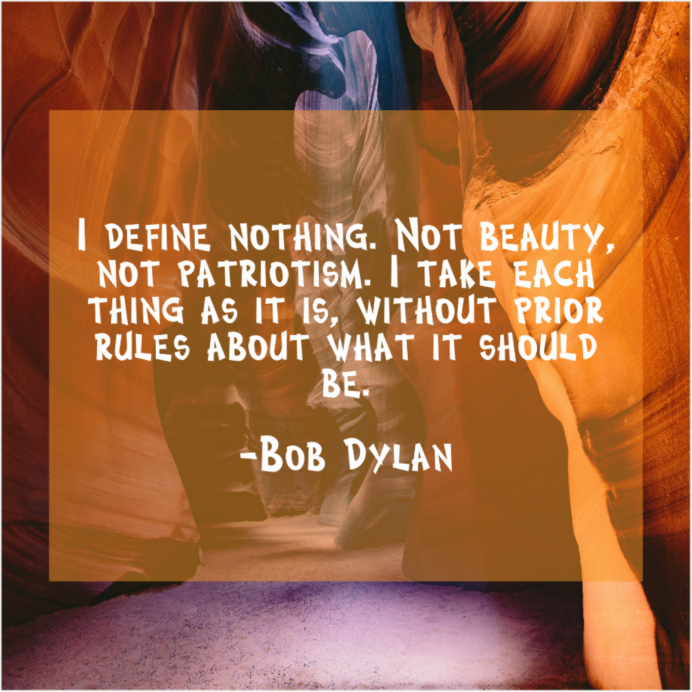 Bob Dylan Bob Dylan – I define nothing. Not beauty… February 18, 2019 admin “I define nothing. Not beauty, not patriotism. I take each thing as it is, without prior rules about what it should be.”-Bob Dylan