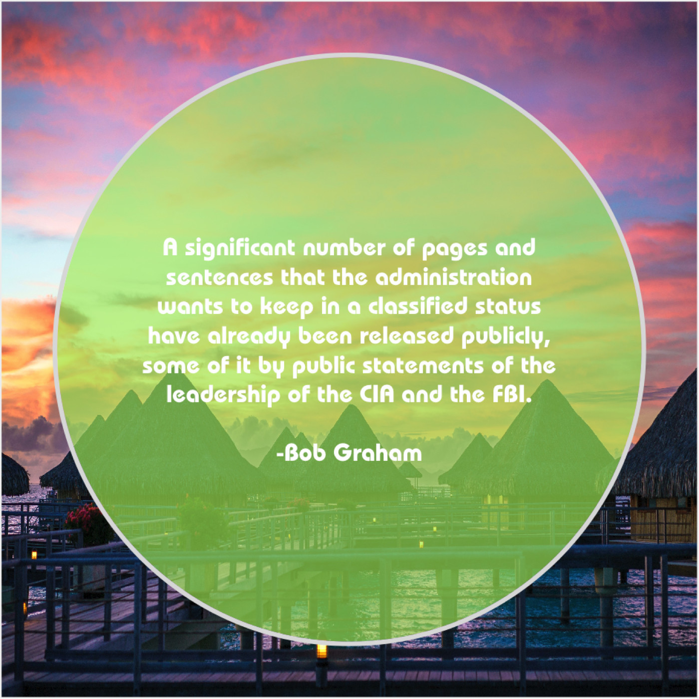 Bob Graham Bob Graham – A significant number of pages… December 28, 2018 admin “A significant number of pages and sentences that the administration wants to keep in a classified status have already been released publicly, some of it by public statements of the leadership of the CIA and the FBI.”-Bob Graham