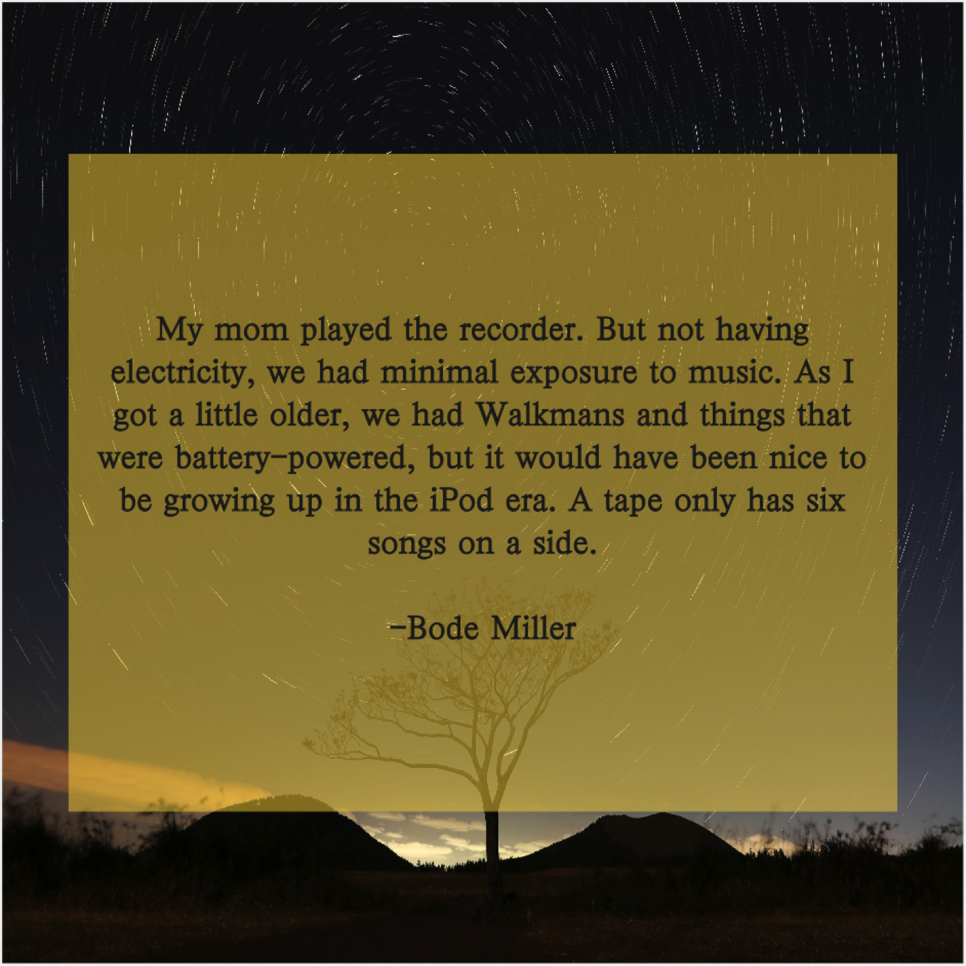 “My mom played the recorder. But not having electricity, we had minimal exposure to music. As I got a little older, we had Walkmans and things that were battery-powered, but it would have been nice to be growing up in the iPod era. A tape only has six songs on a side.”