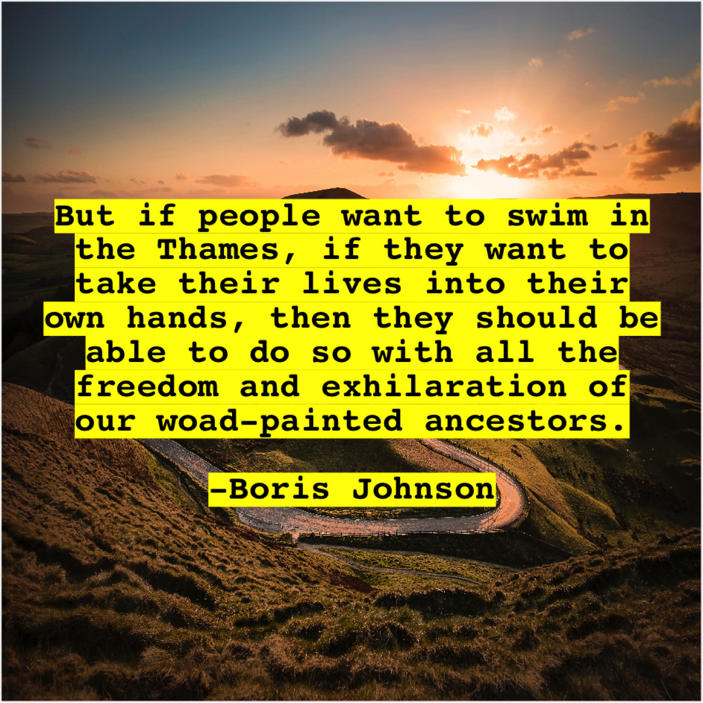 Boris Johnson Boris Johnson – But if people want to… August 21, 2019 admin “But if people want to swim in the Thames, if they want to take their lives into their own hands, then they should be able to do so with all the freedom and exhilaration of our woad-painted ancestors.”-Boris Johnson