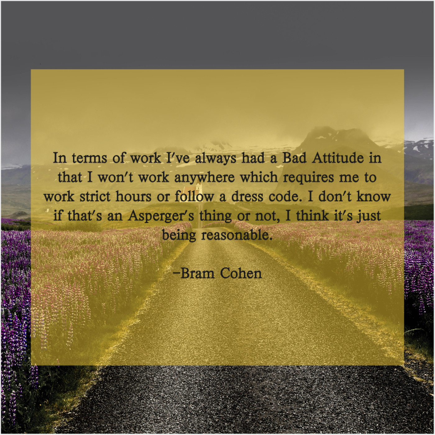 Bram Cohen Bram Cohen – In terms of work I’ve… March 26, 2019 admin “In terms of work I’ve always had a Bad Attitude in that I won’t work anywhere which requires me to work strict hours or follow a dress code. I don’t know if that’s an Asperger’s thing or not, I think it’s just being reasonable.”-Bram Cohen