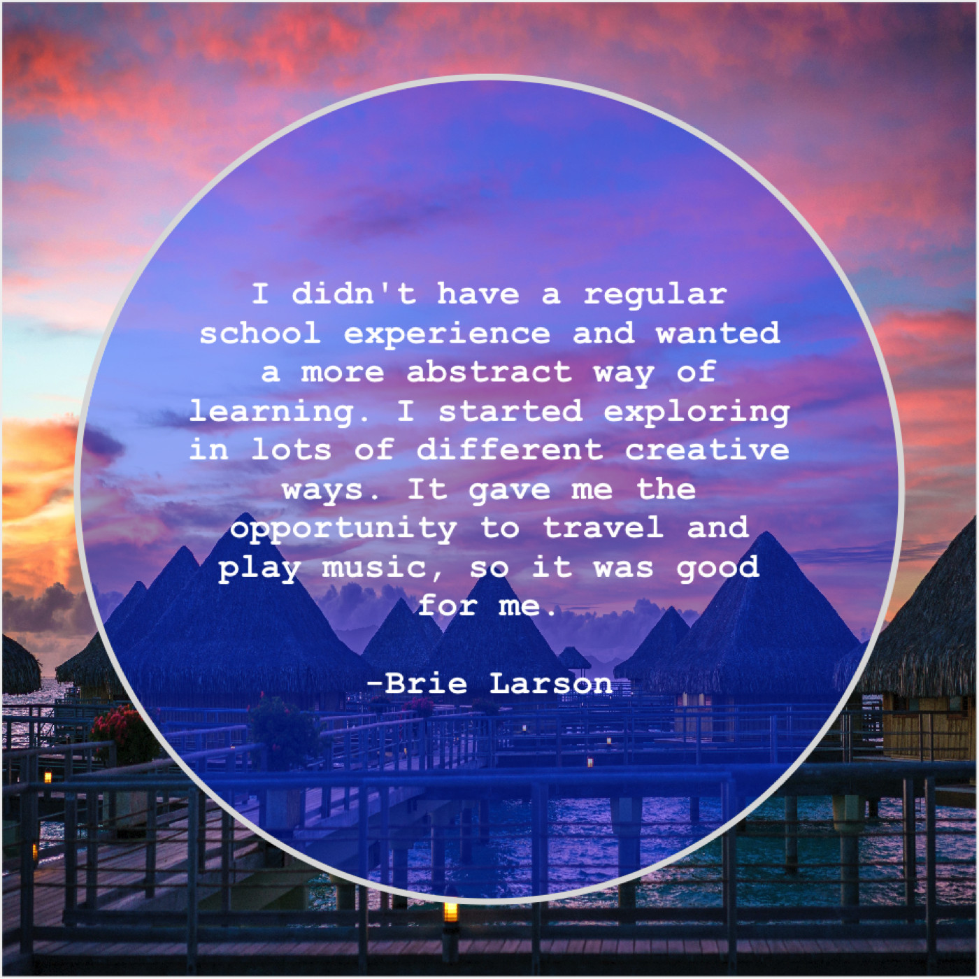 Brie Larson Brie Larson – I didn’t have a regular… September 4, 2019 admin “I didn’t have a regular school experience and wanted a more abstract way of learning. I started exploring in lots of different creative ways. It gave me the opportunity to travel and play music, so it was good for me.”-Brie Larson