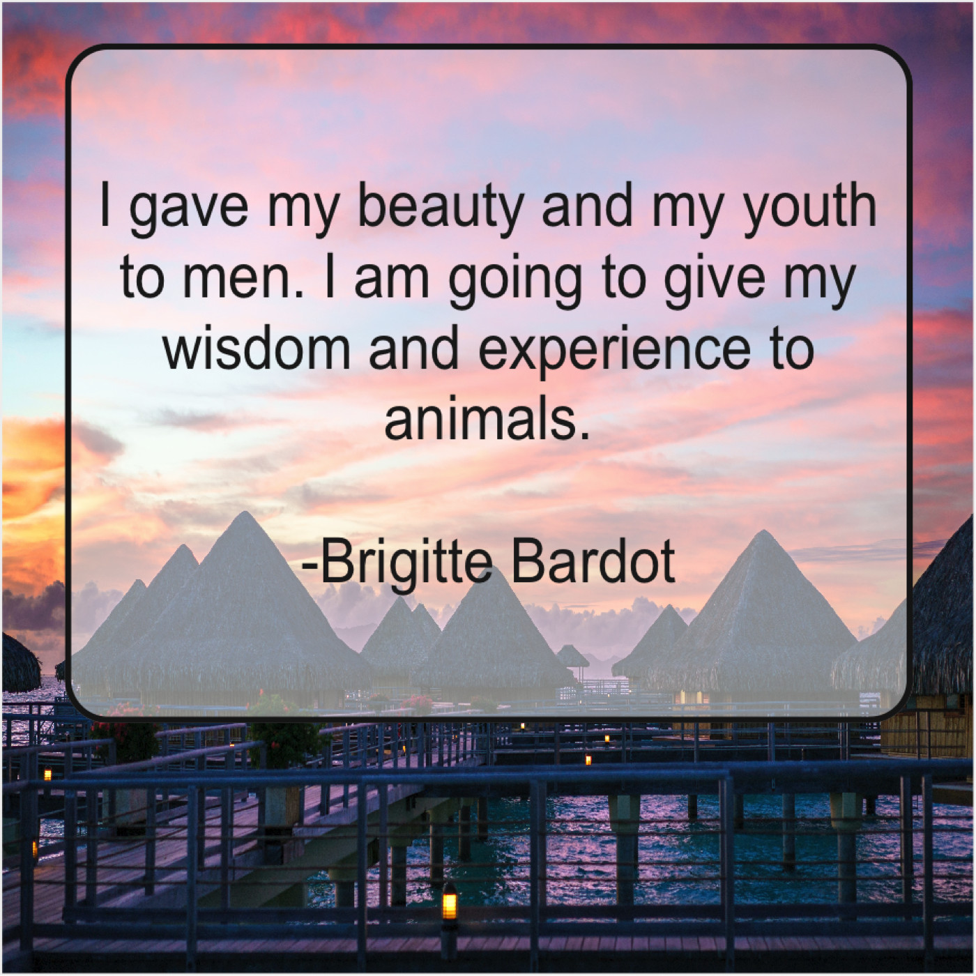 Brigitte Bardot Brigitte Bardot – I gave my beauty and… January 24, 2019 admin “I gave my beauty and my youth to men. I am going to give my wisdom and experience to animals.”-Brigitte Bardot
