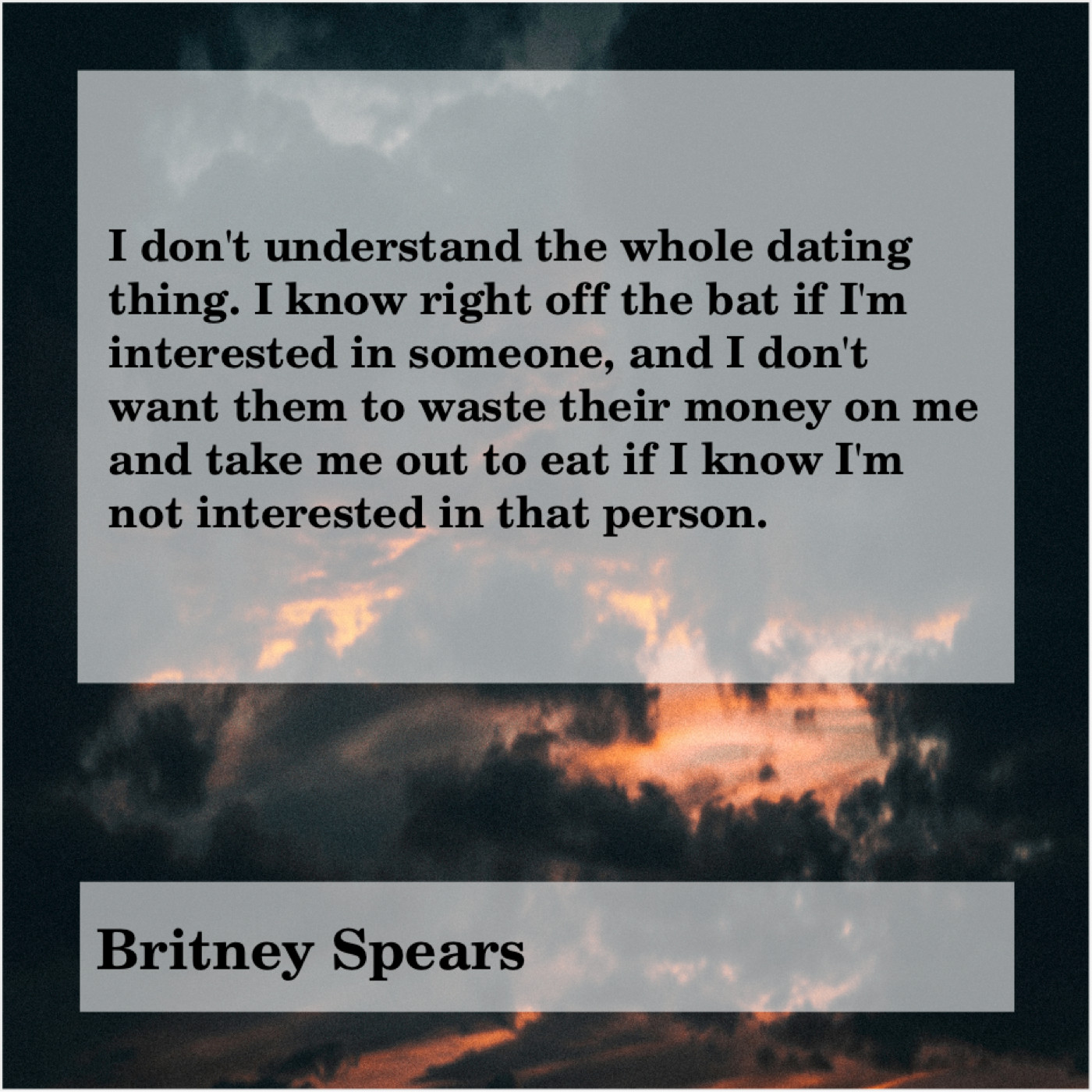 Britney Spears Britney Spears – I don’t understand the whole… April 18, 2019 admin “I don’t understand the whole dating thing. I know right off the bat if I’m interested in someone, and I don’t want them to waste their money on me and take me out to eat if I know I’m not interested in that person.”-Britney Spears