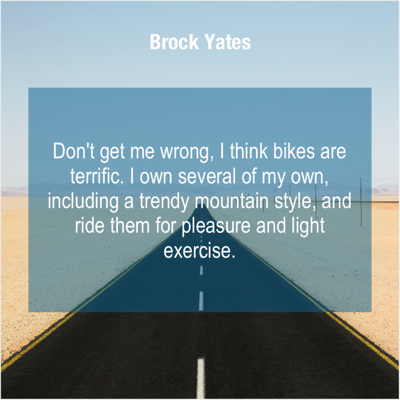 Brock Yates Brock Yates – Don’t get me wrong, I… March 13, 2019 admin “Don’t get me wrong, I think bikes are terrific. I own several of my own, including a trendy mountain style, and ride them for pleasure and light exercise.”-Brock Yates
