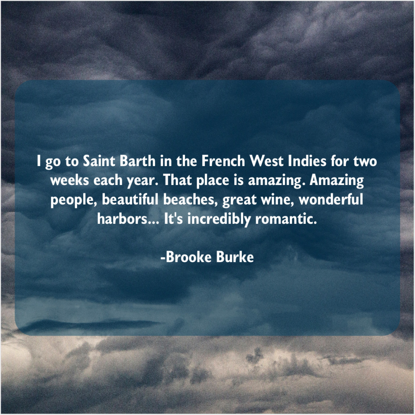 Brooke Burke Brooke Burke – I go to Saint Barth… June 8, 2019 admin “I go to Saint Barth in the French West Indies for two weeks each year. That place is amazing. Amazing people, beautiful beaches, great wine, wonderful harbors… It’s incredibly romantic.”-Brooke Burke