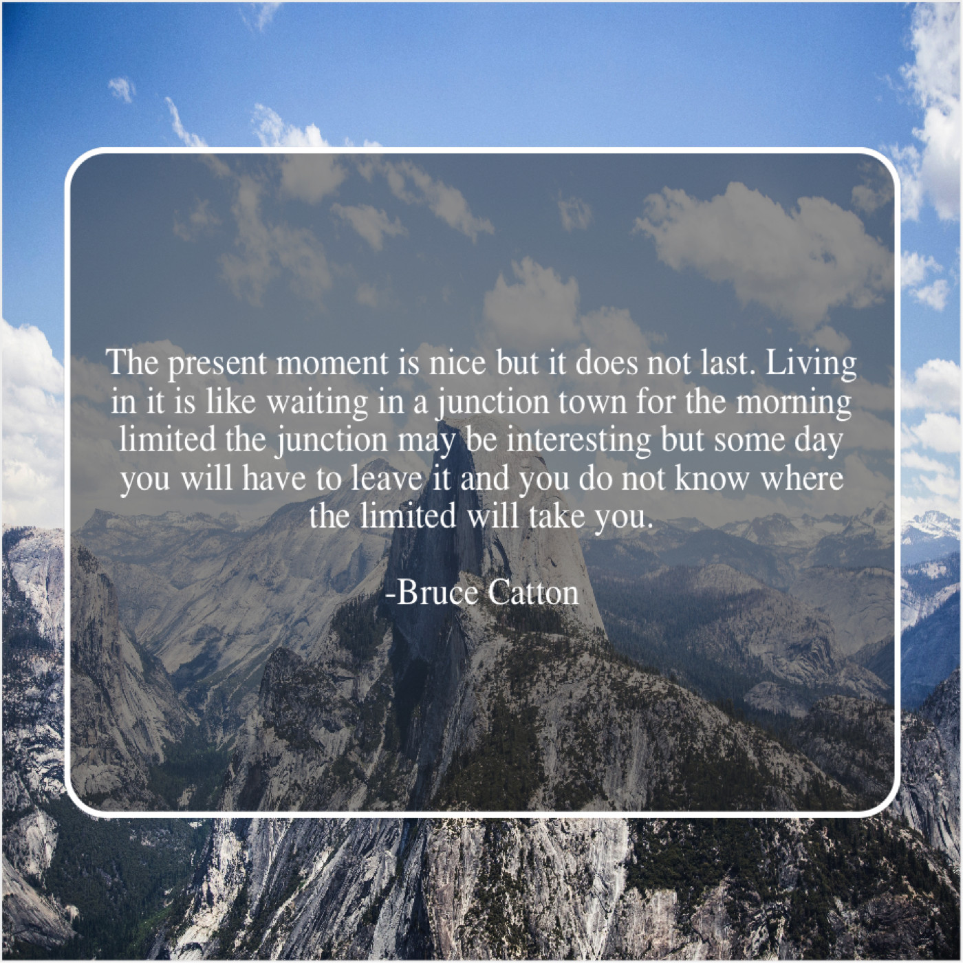 “The present moment is nice but it does not last. Living in it is like waiting in a junction town for the morning limited the junction may be interesting but some day you will have to leave it and you do not know where the limited will take you.”