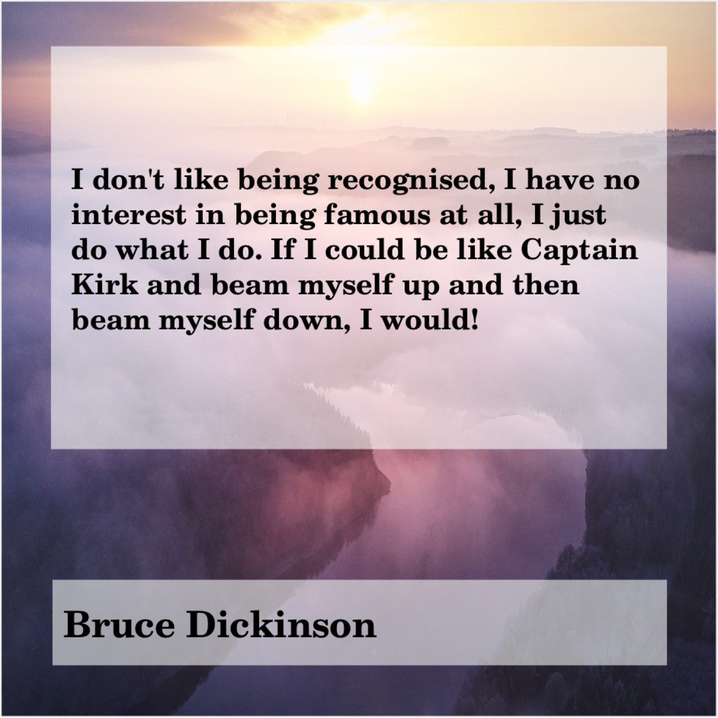 Bruce Dickinson Bruce Dickinson – I don’t like being recognised… July 28, 2019 admin “I don’t like being recognised, I have no interest in being famous at all, I just do what I do. If I could be like Captain Kirk and beam myself up and then beam myself down, I would!”-Bruce Dickinson