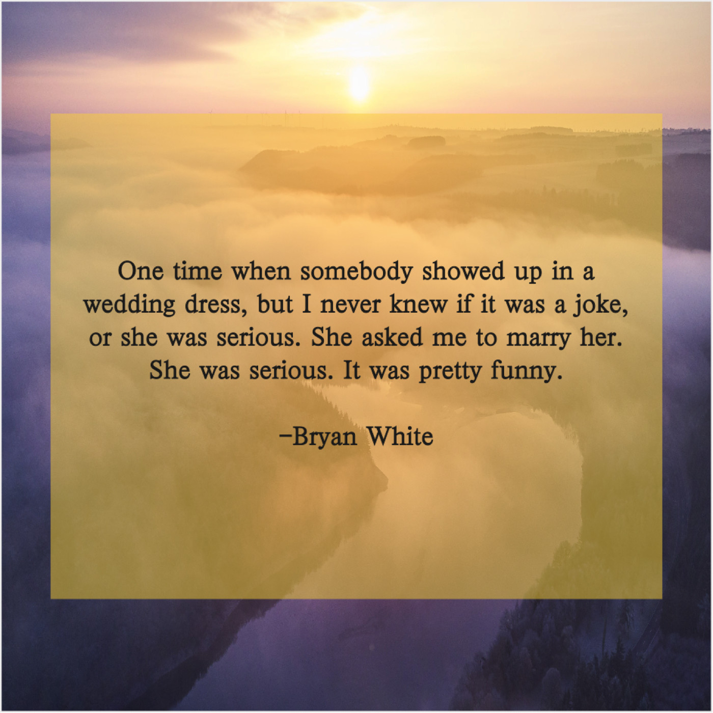 Bryan White Bryan White – One time when somebody showed… June 20, 2019 admin “One time when somebody showed up in a wedding dress, but I never knew if it was a joke, or she was serious. She asked me to marry her. She was serious. It was pretty funny.”-Bryan White