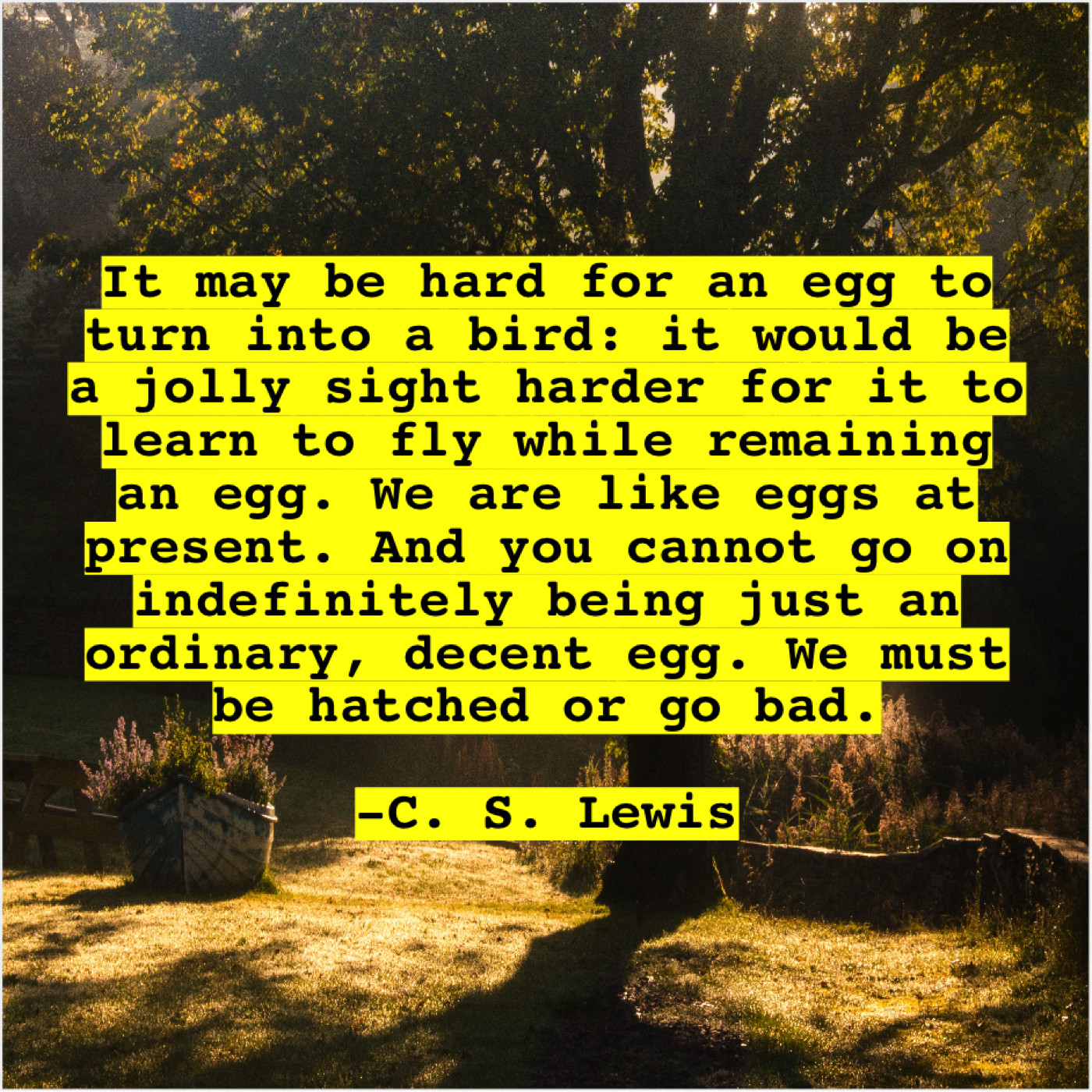 “It may be hard for an egg to turn into a bird: it would be a jolly sight harder for it to learn to fly while remaining an egg. We are like eggs at present. And you cannot go on indefinitely being just an ordinary, decent egg. We must be hatched or go bad.”