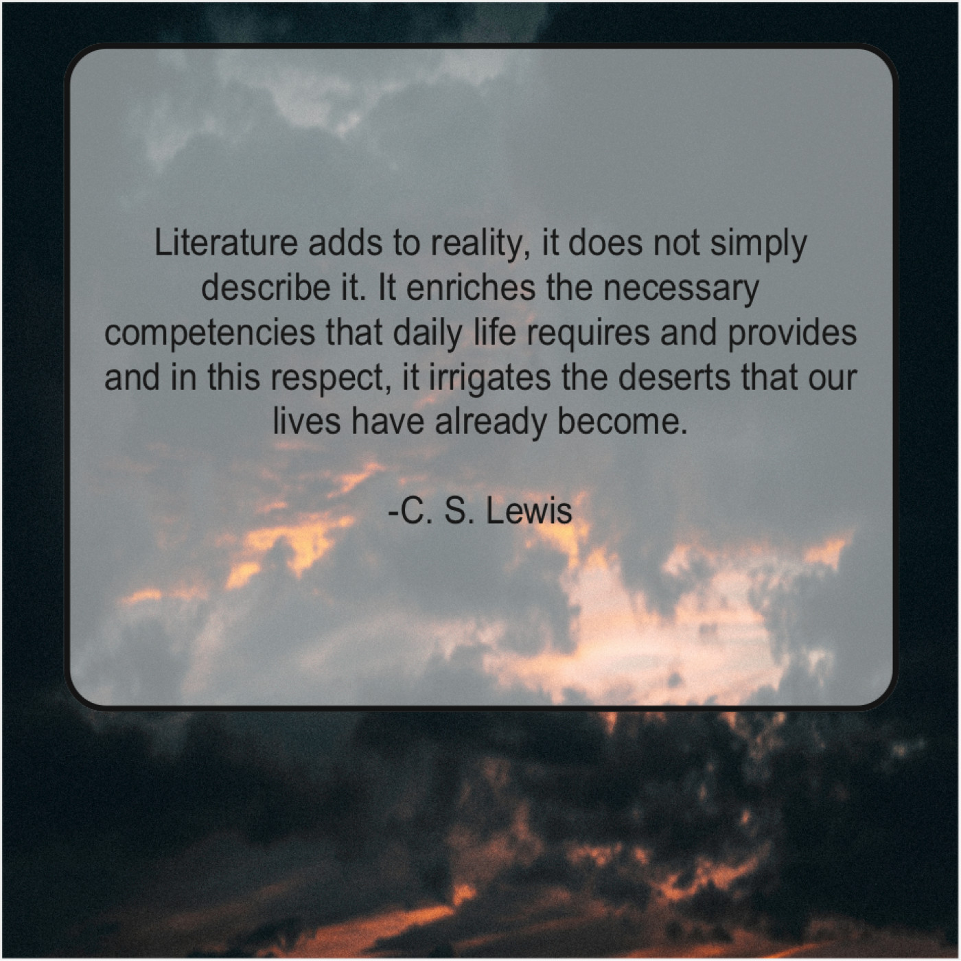 C. S. Lewis C. S. Lewis – Literature adds to reality, it… June 18, 2019 admin “Literature adds to reality, it does not simply describe it. It enriches the necessary competencies that daily life requires and provides and in this respect, it irrigates the deserts that our lives have already become.”-C. S. Lewis