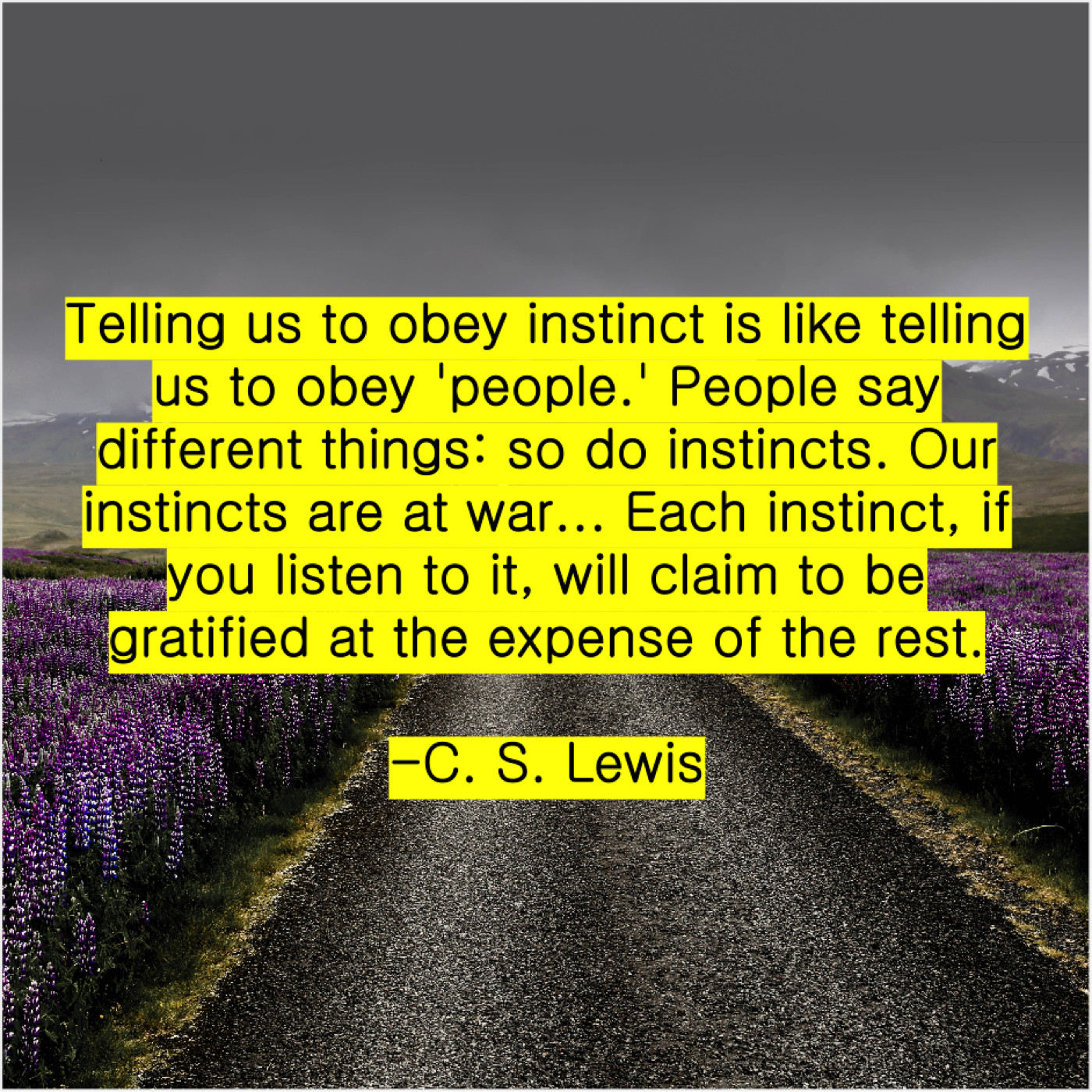 C. S. Lewis C. S. Lewis – Telling us to obey instinct… July 28, 2019 admin “Telling us to obey instinct is like telling us to obey ‘people.’ People say different things: so do instincts. Our instincts are at war… Each instinct, if you listen to it, will claim to be gratified at the expense of the rest.”-C. S. Lewis