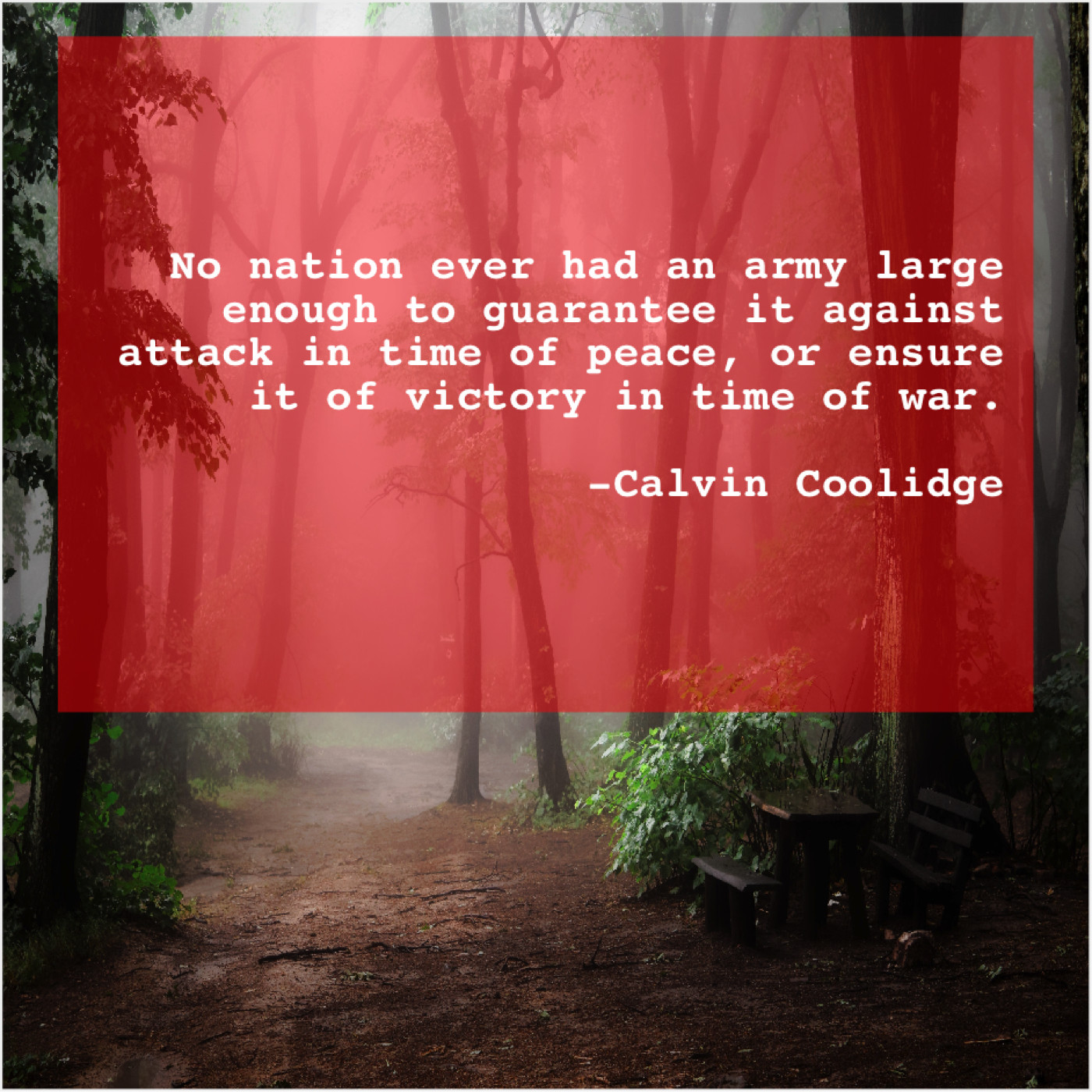 Calvin Coolidge Calvin Coolidge – No nation ever had an… February 9, 2019 admin “No nation ever had an army large enough to guarantee it against attack in time of peace, or ensure it of victory in time of war.”-Calvin Coolidge