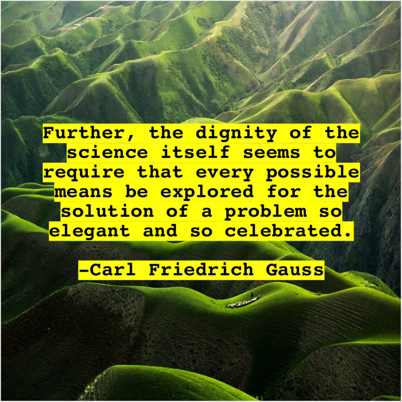 Carl Friedrich Gauss Carl Friedrich Gauss – Further, the dignity of the… May 29, 2019 admin “Further, the dignity of the science itself seems to require that every possible means be explored for the solution of a problem so elegant and so celebrated.”-Carl Friedrich Gauss