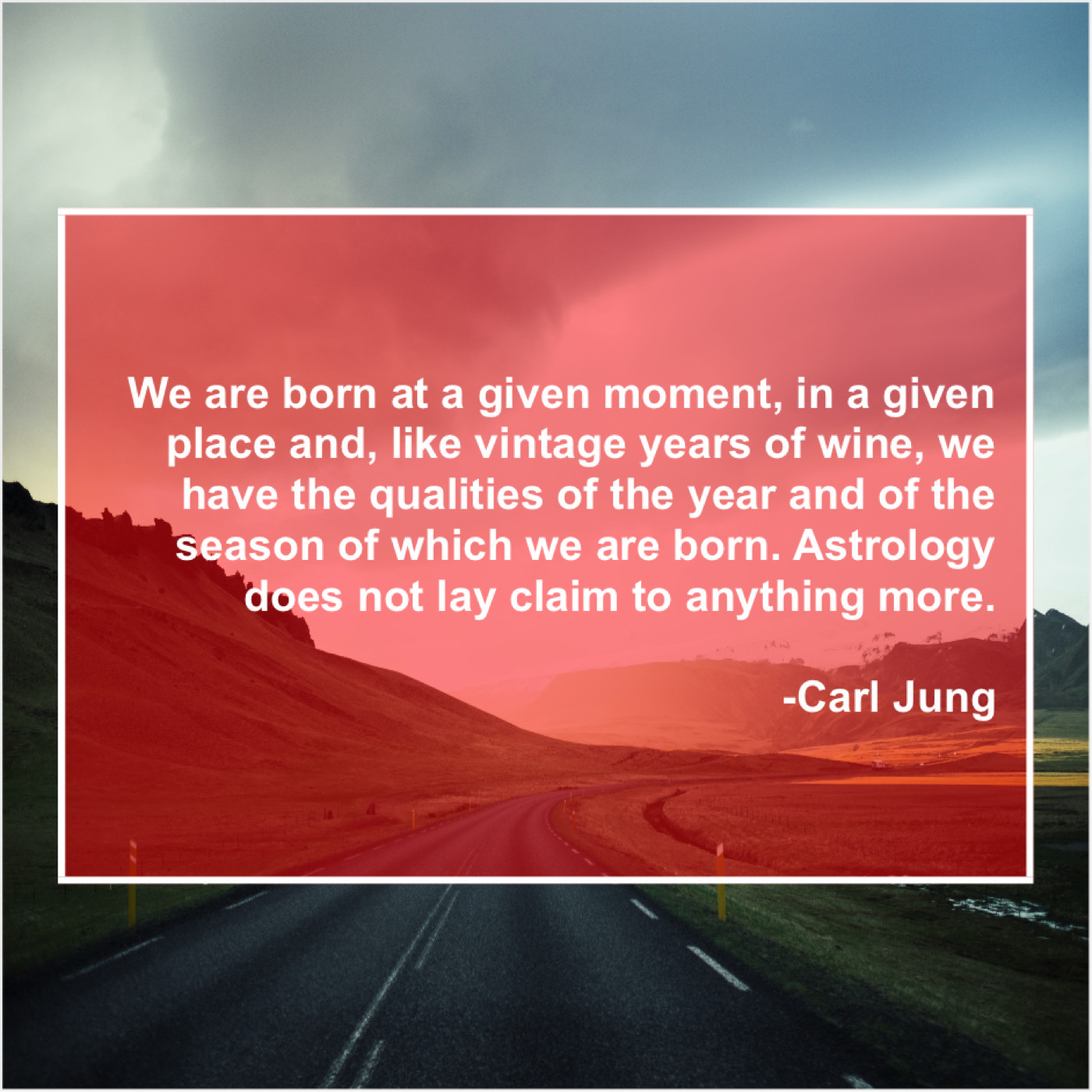 Carl Jung Carl Jung – We are born at a… June 20, 2019 admin “We are born at a given moment, in a given place and, like vintage years of wine, we have the qualities of the year and of the season of which we are born. Astrology does not lay claim to anything more.”-Carl Jung