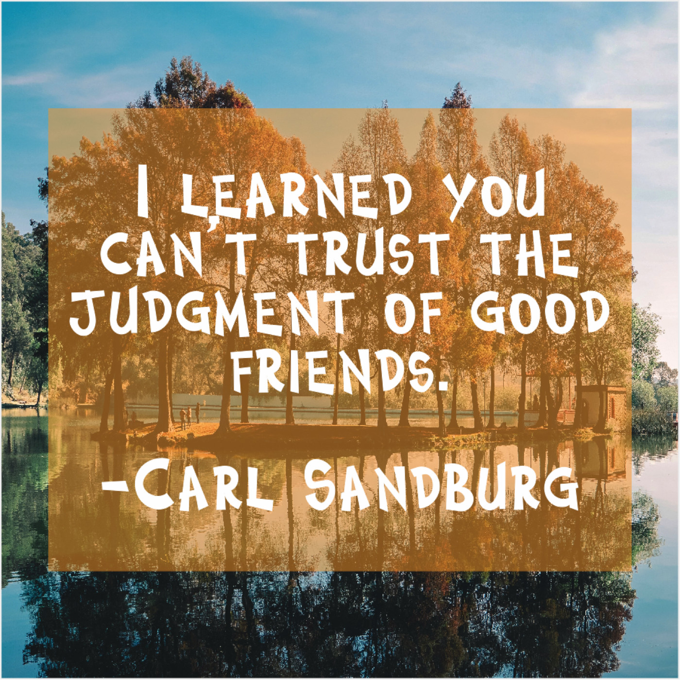 Carl Sandburg Carl Sandburg – I learned you can’t trust… June 21, 2019 admin “I learned you can’t trust the judgment of good friends.”-Carl Sandburg
