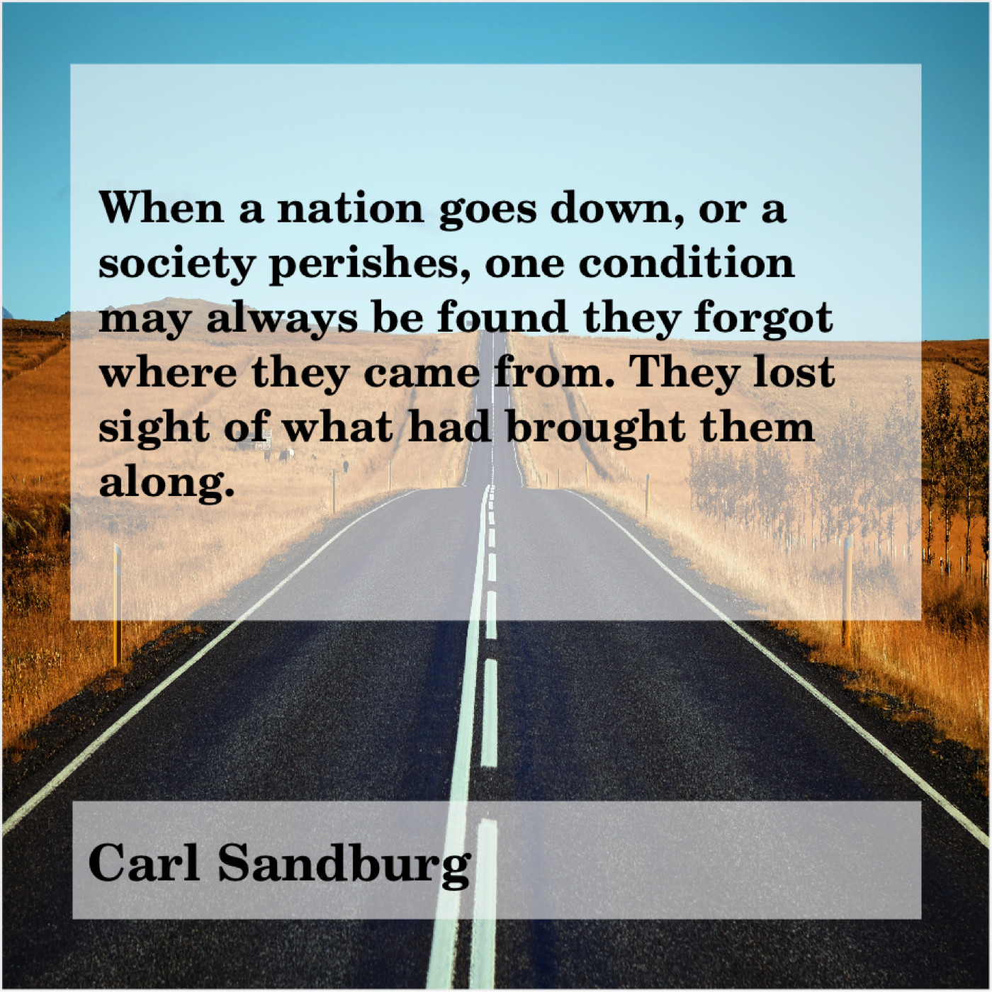 Carl Sandburg Carl Sandburg – When a nation goes down… June 21, 2019 admin “When a nation goes down, or a society perishes, one condition may always be found they forgot where they came from. They lost sight of what had brought them along.”-Carl Sandburg