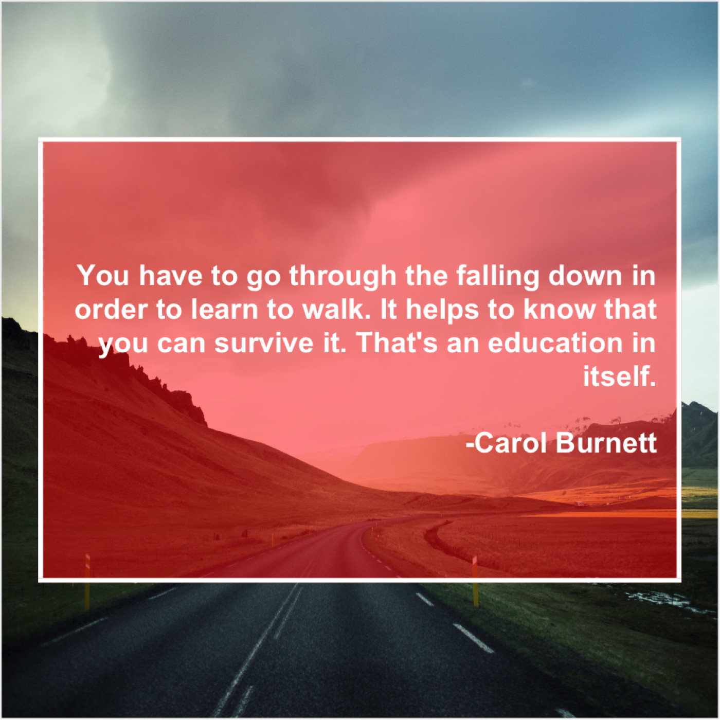 Carol Burnett Carol Burnett – You have to go through… June 26, 2019 admin “You have to go through the falling down in order to learn to walk. It helps to know that you can survive it. That’s an education in itself.”-Carol Burnett