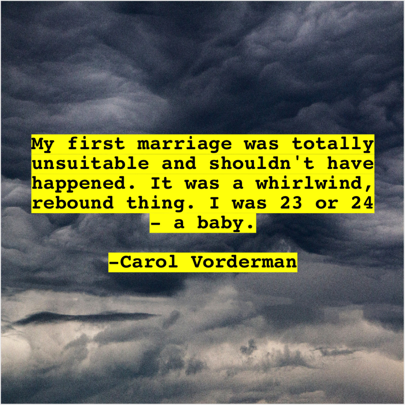 Carol Vorderman Carol Vorderman – My first marriage was totally… July 24, 2019 admin “My first marriage was totally unsuitable and shouldn’t have happened. It was a whirlwind, rebound thing. I was 23 or 24 – a baby.”-Carol Vorderman