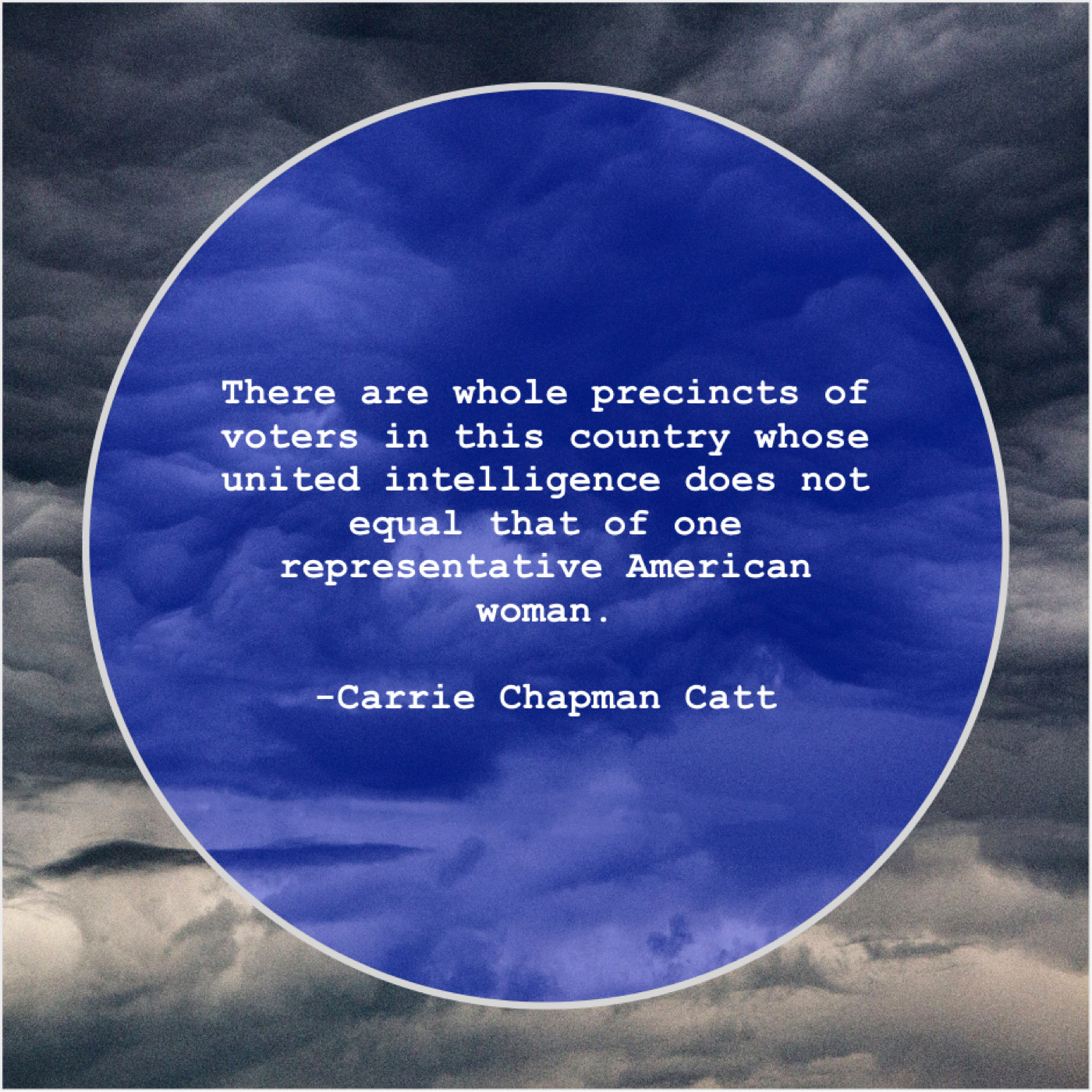 Carrie Chapman Catt Carrie Chapman Catt – There are whole precincts of… September 28, 2019 admin “There are whole precincts of voters in this country whose united intelligence does not equal that of one representative American woman.”-Carrie Chapman Catt