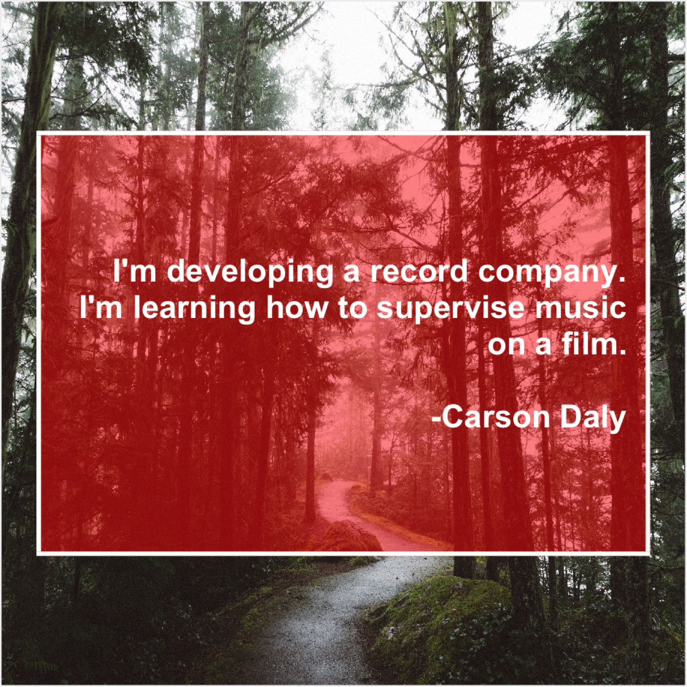 Carson Daly Carson Daly – I’m developing a record company… April 11, 2019 admin “I’m developing a record company. I’m learning how to supervise music on a film.”-Carson Daly
